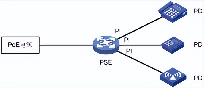 PoE系统如下图所示,包括PoE电源、PSE(Power Sourcing Equipment,供电设备)、PI(Power Interface,电源接口)和PD。