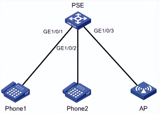 PoE典型组网如下图,通过PSE(Power Sourcing Equipment,供电设备),GigabitEthernet1/0/1、GigabitEthernet1/0/2接入IP电话,GigabitEthernet1/0/3接入AP设备。