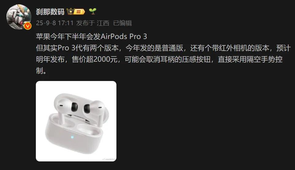 但这款新AirPods Pro不是迭代,不会被命名为“AirPods Pro 4”,而是作为“AirPods Pro 3”的高端版本,可能会被加上后缀,类似AirPods 4的主动降噪版。