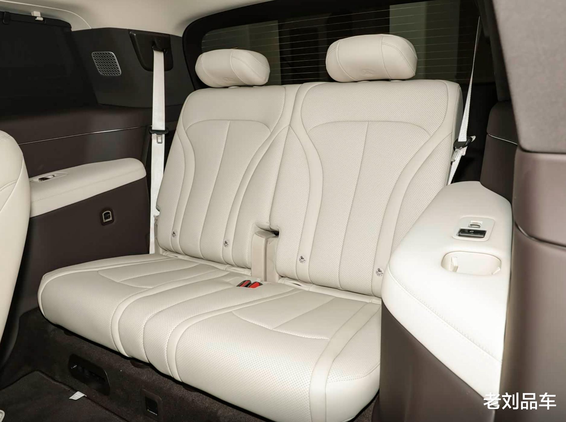 后排空间是腾势N9的优势项目,调整好前排合适的驾驶位,第二排腿部空间轻松超过两拳,支持电动大幅前后移动和靠背调节,座椅填充物柔软,全系带第二排加热/通风/按摩功能。得益于方正的车顶线条,头部空间非常宽裕,有三拳左右的距离。全系二排独立座椅,后排是隐私玻璃。尊荣型和尊越型为手动侧窗遮阳帘,旗舰版为电动调节。17.3英寸后排吸顶屏,除了入门版都是标配,入门版选装费用是1.6万元,与其选装不如直接上中配版本。第三排空间表现很好,功能层面也有USB和杯架,只不过只是旗舰版才有三排的座椅加热。从整体座舱表现看,同级车的座舱配置基本都在同一水平线,比拼更多的还是空间感和设计风格,而腾势N9在空间上有优势,设计风格也很简洁,比较符合大众审美眼光。