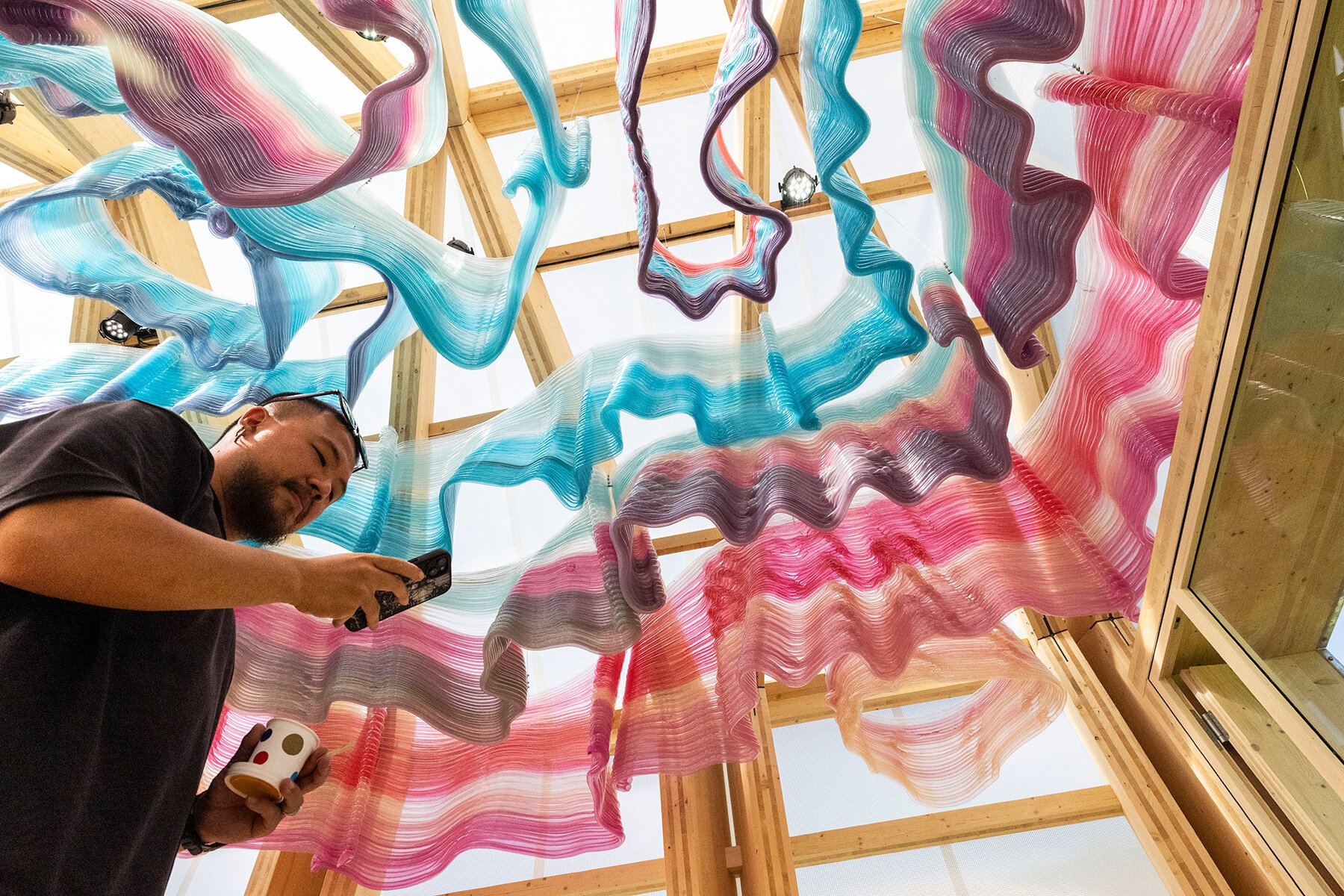 内部空间的最大亮点是色彩斑斓的3D打印穹顶。该穹顶由苏黎世联邦理工学院,机器人制造实验室采用“空心”实验性挤压技术制造,原为外墙面板开发,后创新用于大跨度围护结构。最终,这一超轻结构覆盖面积超过250平方米,总重量却不足一吨,极大提升了材料利用效率与结构性能。