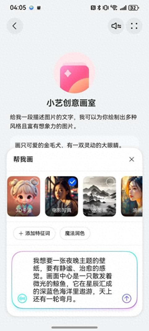 于是,我打开已升级鸿蒙5的华为nova13手机,在小艺App-发现-智能体里找到“小艺创意画室”Agent,决定把心中构想的静谧画面描述给TA:“我想要一张夜晚主题的壁纸,要有静谧、治愈的感觉。画面中心是一只散发着微光的鲸鱼,在星辰汇成的深蓝色海洋里遨游,天上还有一轮弯月。”为了让画面更有质感,我特意选择了“电影写真”风格。