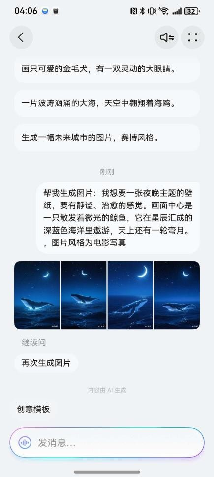很快,一组充满故事感的图片便生成了。深蓝色的夜空下,一轮弯月静静悬挂,巨大的鲸鱼周身散发着柔和光芒,在星辰交织的海洋里缓缓游弋。整个画面梦幻又治愈,正是我想要的感觉!我立刻将其设为新壁纸,现在每次点亮屏幕,都觉得心情平静了许多。