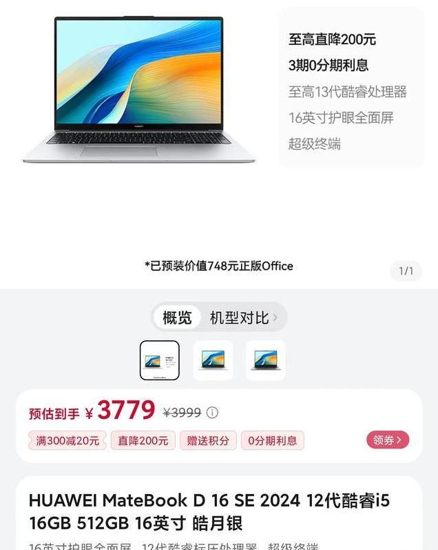 笔记本电脑方面的优惠力度非常小,比如matebookD 16SE12代酷睿,只有200元的优惠,16+512GB版本原价3999元,如今需要3799元。