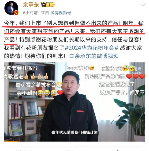 在12月25日,余承东在社交平台更新动态,为2024年的花粉节预热,余承东发视频表示:“今年,我们上市了别人想得到但做不到的产品,明年,我们会有大家想不到的产品,未来,还会有大家不敢想的产品”。