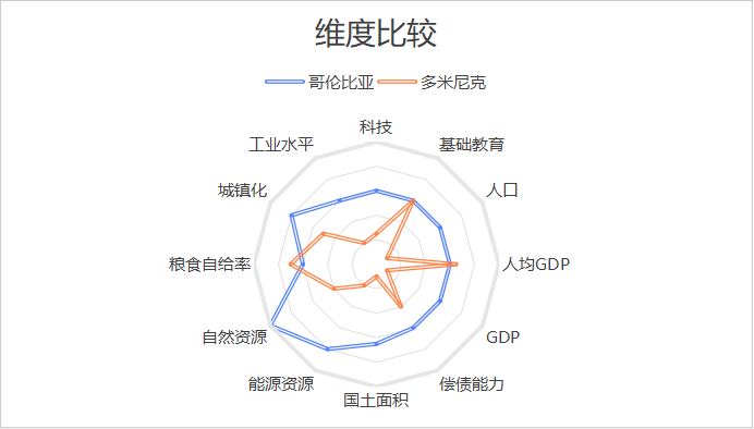 如果用雷达图粗略对比多米尼克与哥伦比亚的各维度数据,其人口、国土面积、GDP三项差距过大。