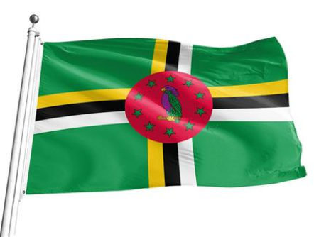 多米尼克国旗底色为绿色,黄、黑、白三色的十字贯穿旗面,中央的十字交叉处为红色圆地,内有一只鹦鹉及其周围的十颗五角星。