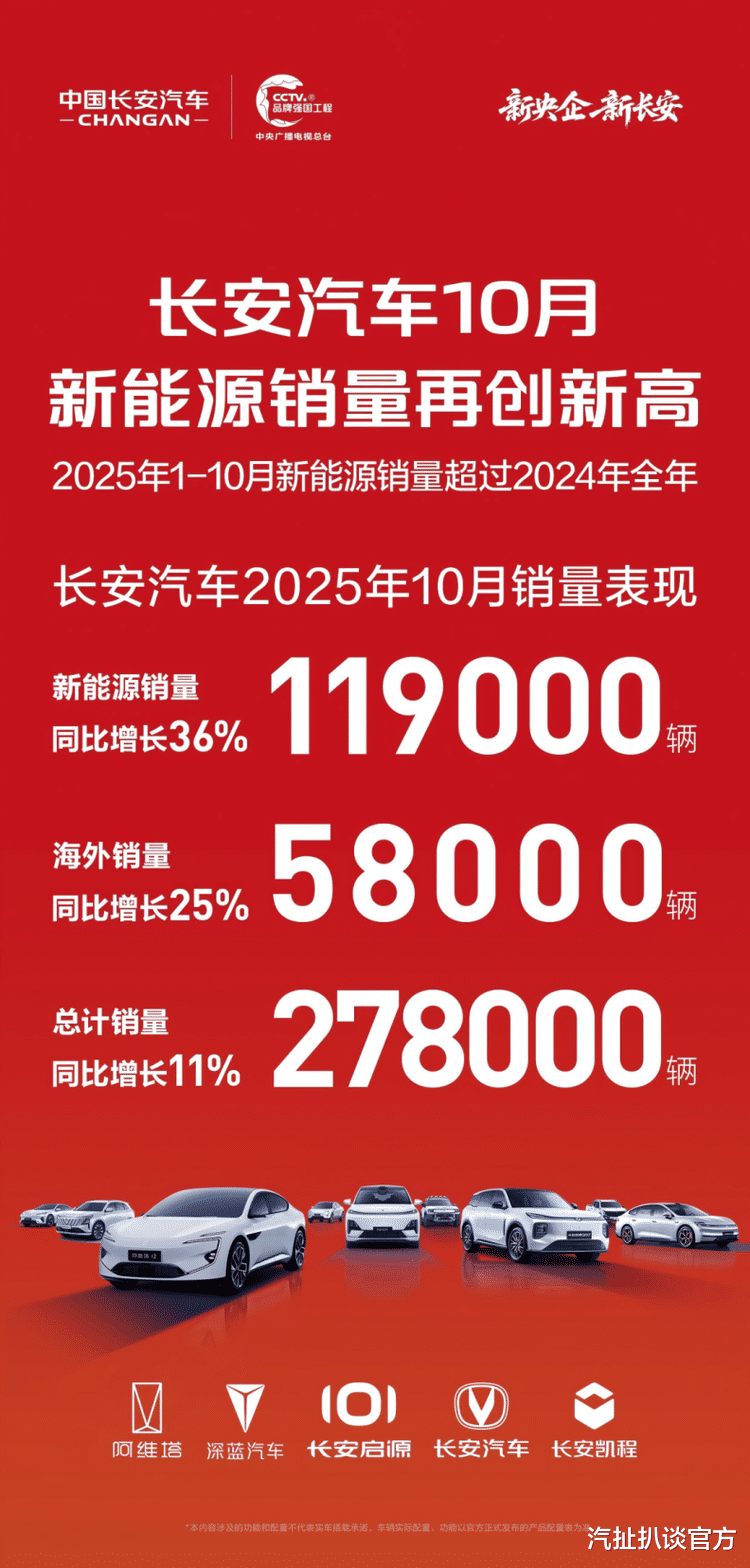在品牌势能持续走高的同时,长安的市场表现提供了最有力的佐证。2025年1-10月,长安汽车总体销量达2,374,002辆,同比增长10.12%;其中新能源汽车销量868,724辆,同比增长60.58%,并且已超去年全年新能源总销量;海外销量522,660辆。新能源与海外市场已成为长安增长的“双引擎”,展现出强劲攀升势头。