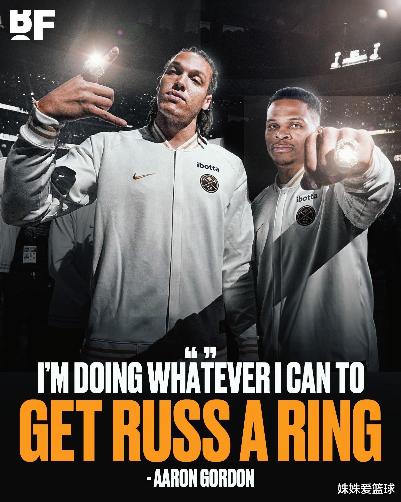 感谢戈登带少爷圆梦!拿着300年薪干着3000万的活,甘愿放下身段干脏活累活,威少在打最纯粹的篮球,他要和掘金这帮兄弟并肩作战拿到总冠军。