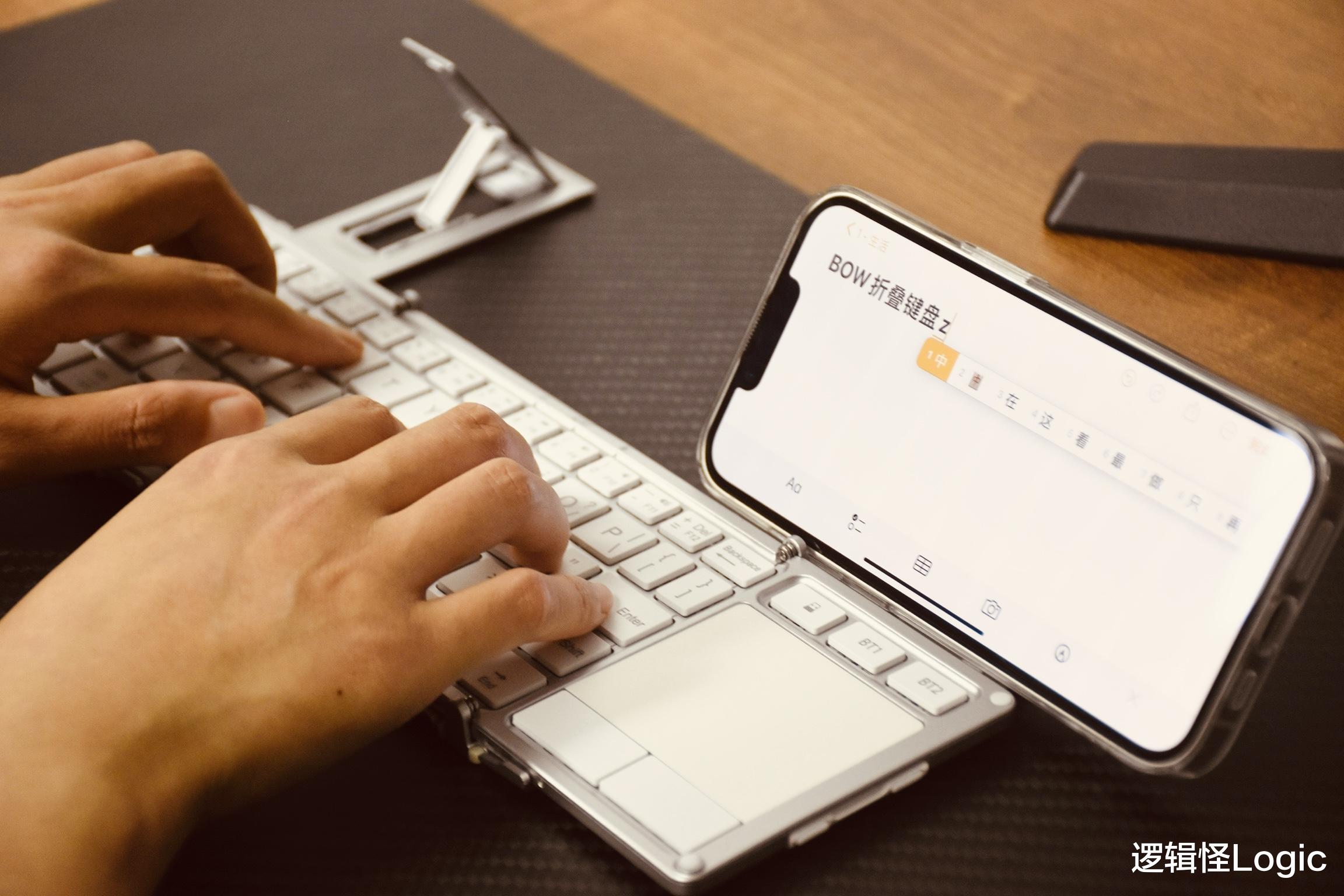 为了直观感受它的便携性,我特意拿出了iPhone 14进行对比——折叠后的BOW键盘长度略长于手机,但厚度几乎一致,宽度也仅稍宽一点,完全可以单手稳稳握住。搭配附赠的收纳袋,还能进一步保护键盘免受刮擦,出差党、学生党都能实现“一包走天下”的极简出行。