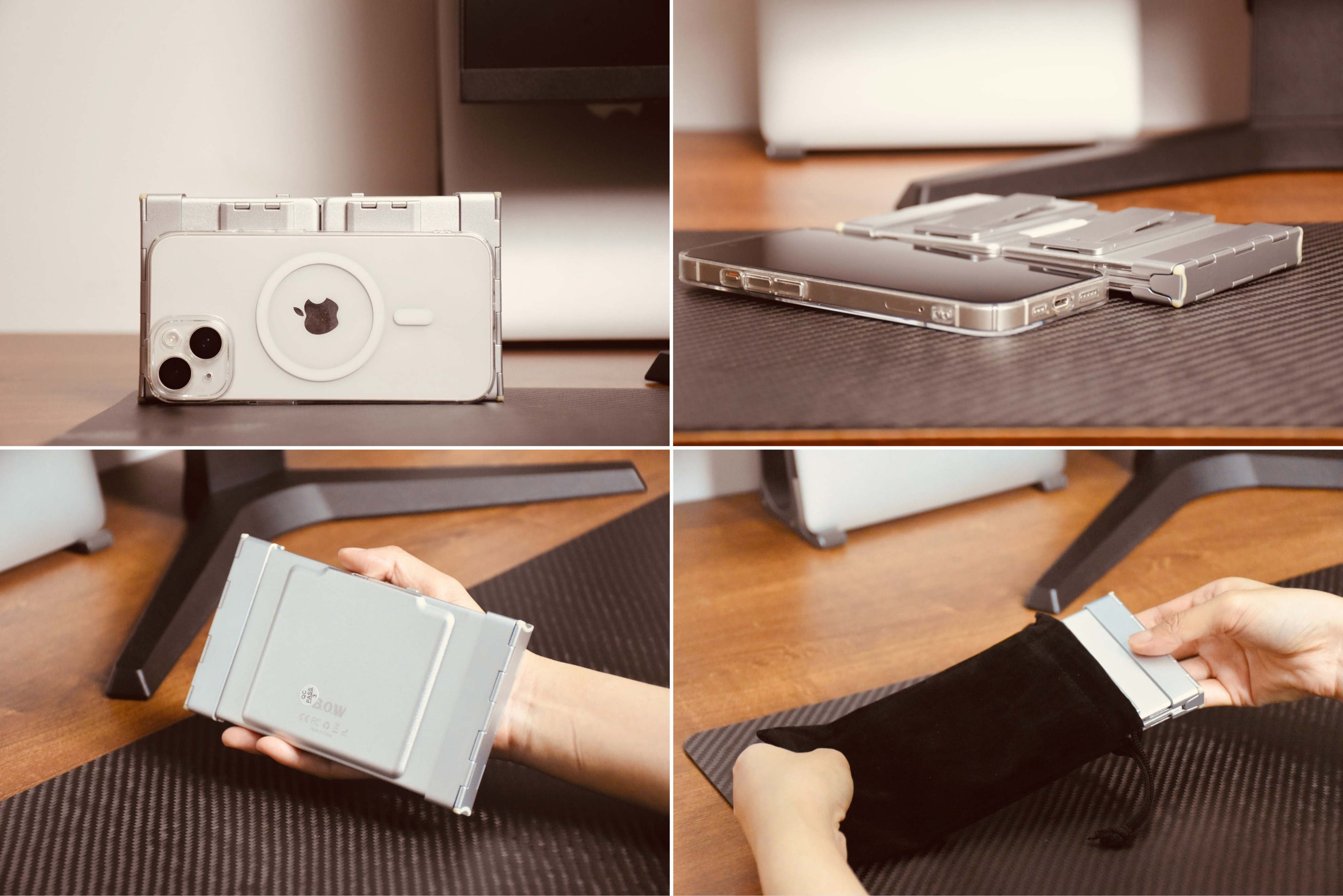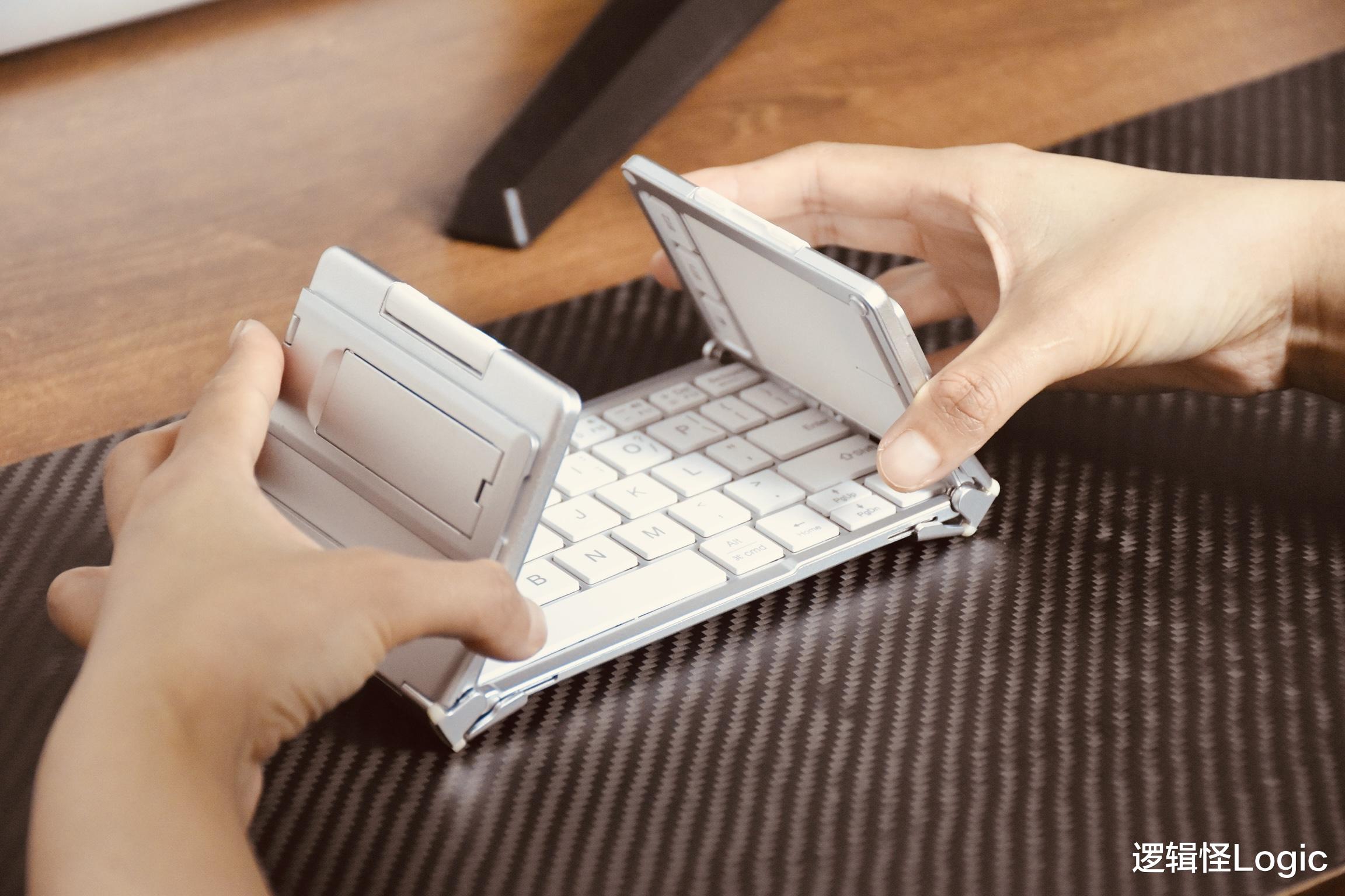 值得一提的是,这款键盘底部隐藏着2个折叠支架,展开即用,角度约为60度,稳固支撑各类移动设备。支架设计巧妙,无需额外购买配件,也不占额外空间。无论是横放平板还是竖握手机,都能找到合适的观看角度,尤其适合在高铁、机场、公园长椅等非桌面场景使用,真正实现了“随时随地,想打就打”的自由办公体验。