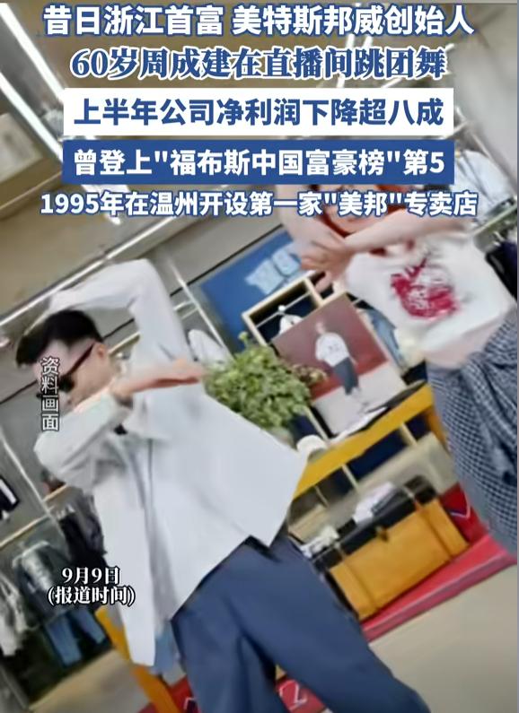曾登上“福布斯中国富豪榜”第5,60岁的美特斯邦威创始人周成建,因上半年公司净利润下降超八成,在直播间跳团舞引流赚钱。