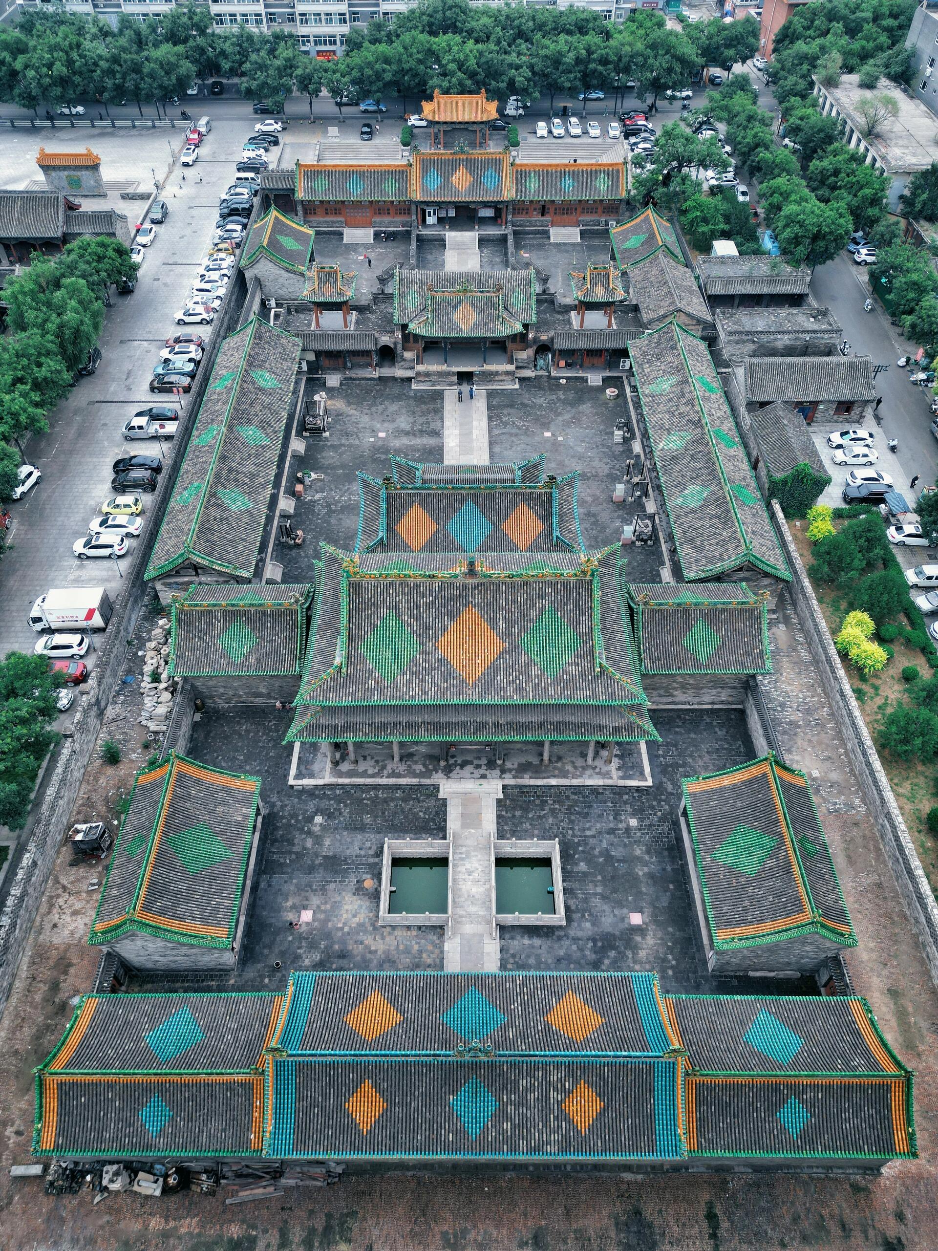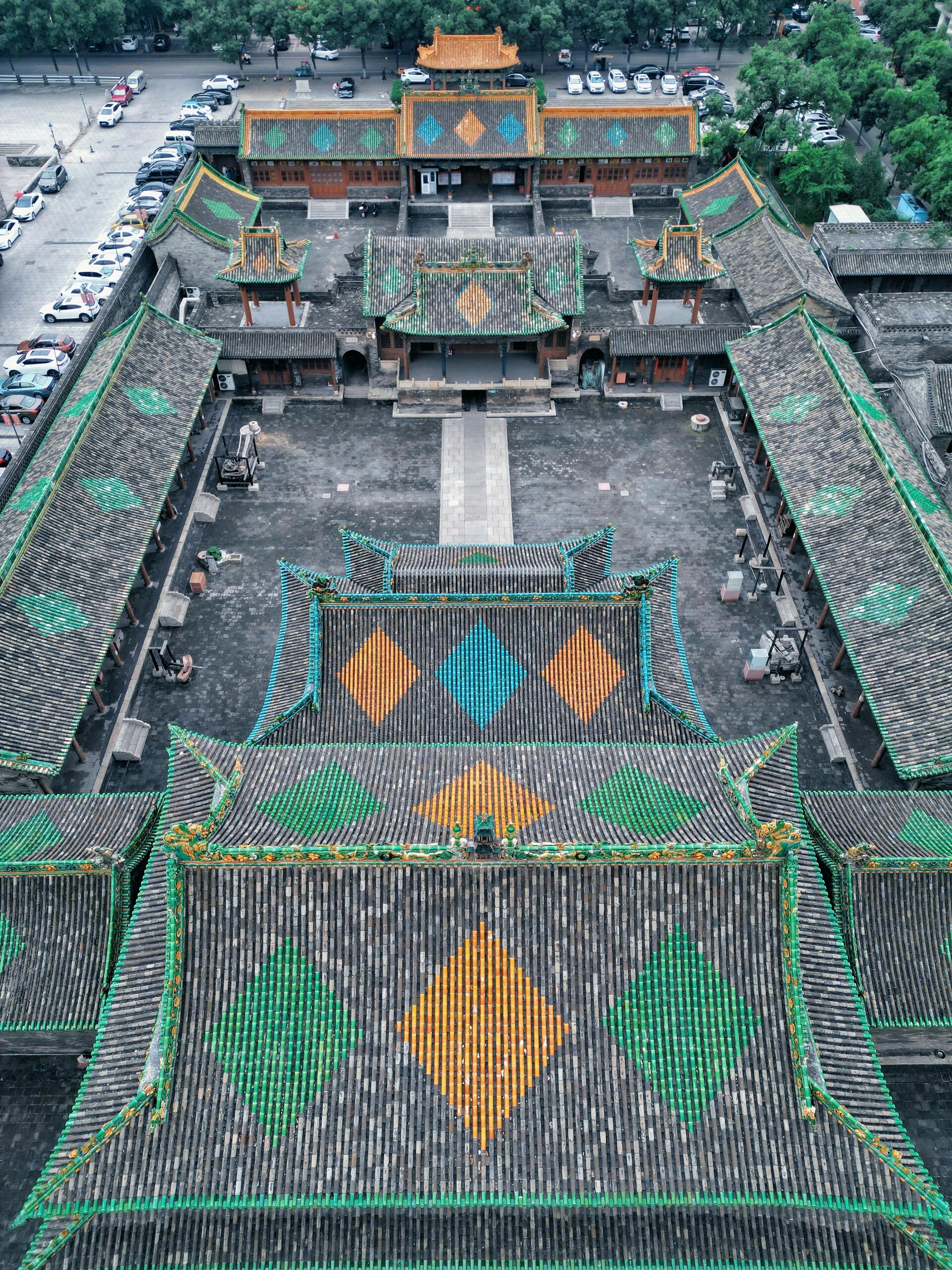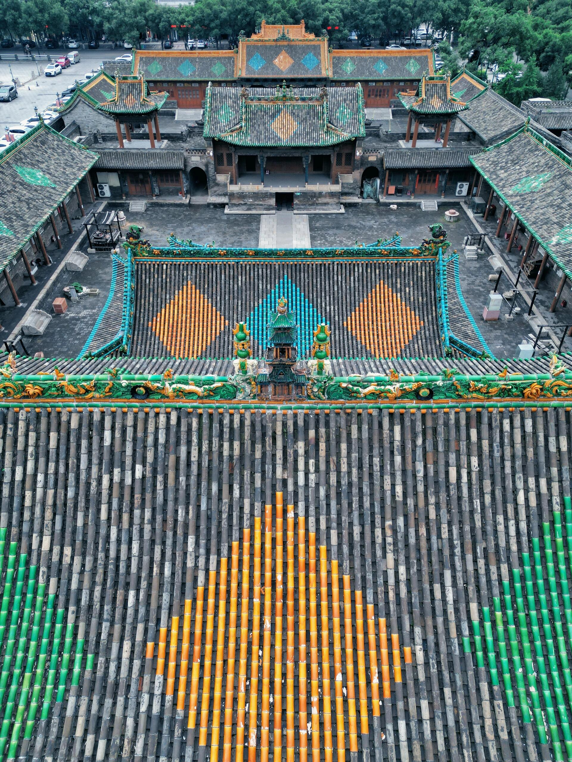 但介休城隍庙最令人瞩目的,还当属那美轮美奂的琉璃艺术。当你站在城隍庙前,抬头仰望,首先映入眼帘的便是那几重殿宇的屋顶。屋顶上饰有黄绿蓝三色方心,色彩斑斓,在阳光的照耀下熠熠生辉。若是借助无人机的视角俯瞰,那景象更是壮观得令人窒息。一片片琉璃瓦整齐排列,组成了一幅幅绚丽的图案,仿佛是天空中飘落的彩云,又似一幅精美的织锦铺展在庙宇之上。每一片琉璃瓦都承载着工匠们的心血与智慧,它们相互交织,共同构成了介休城隍庙独特的天际线,诉说着这座城市的历史与文化。