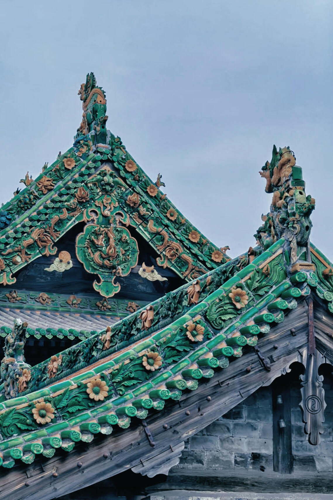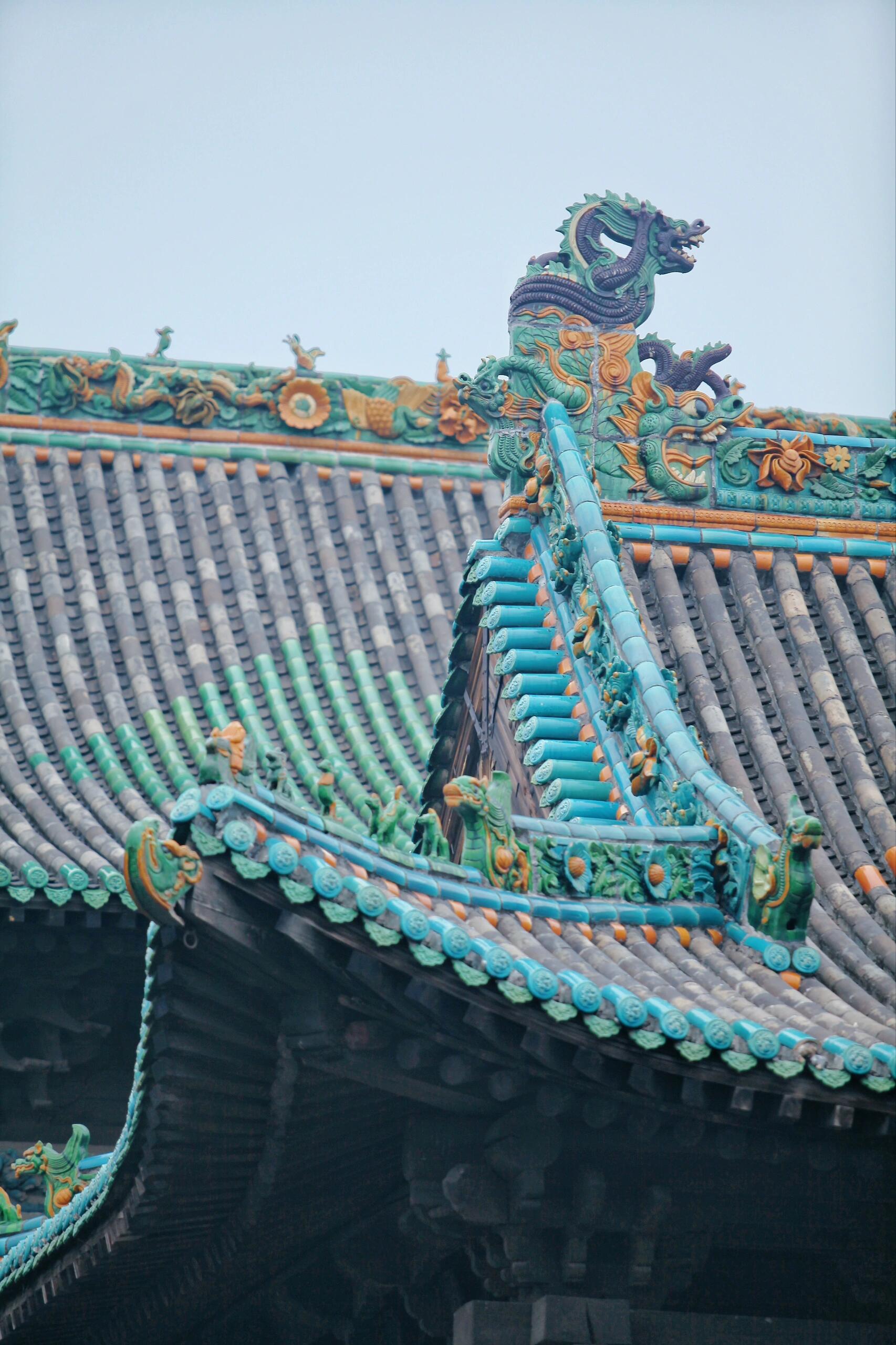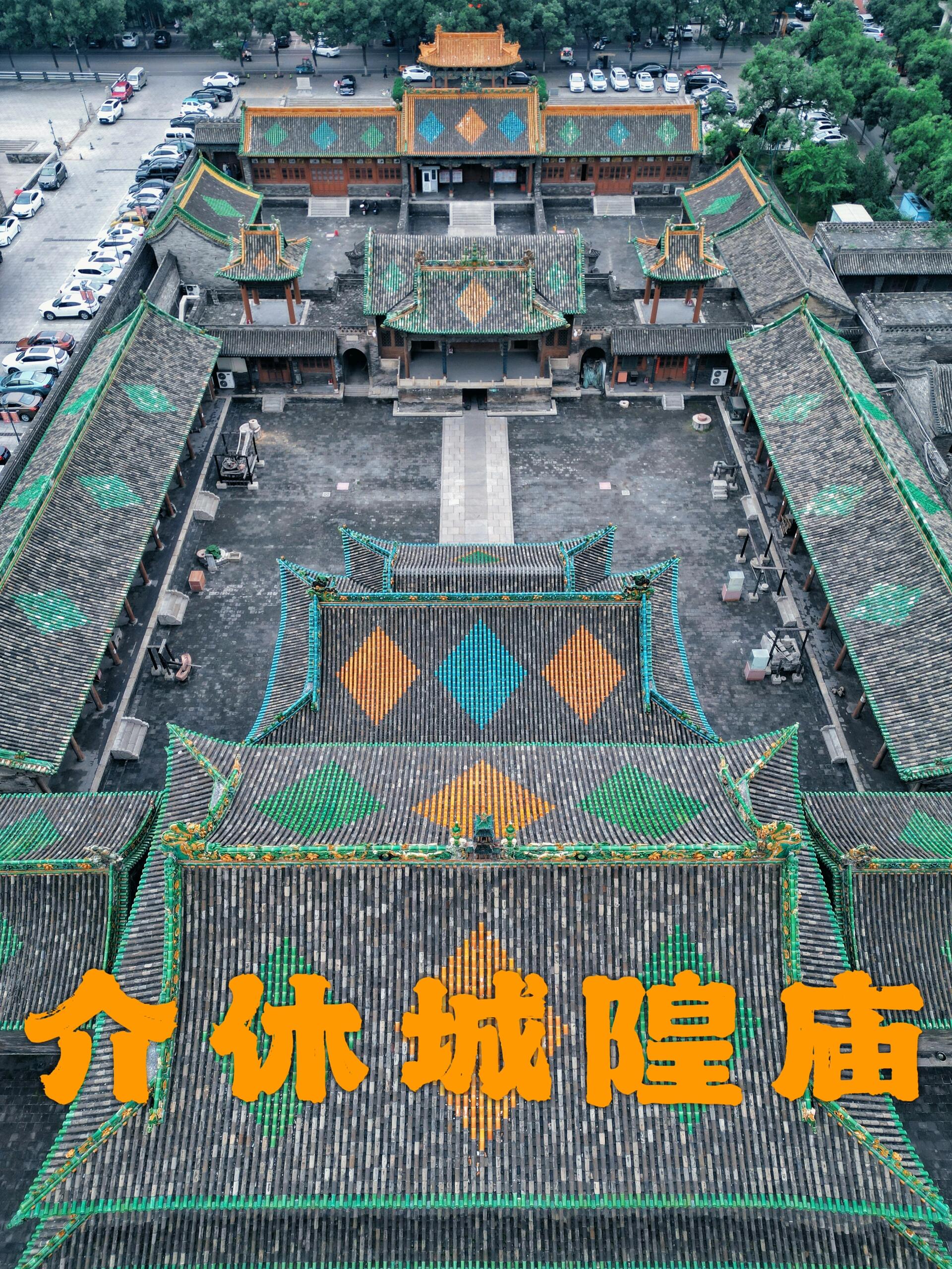 但介休城隍庙最令人瞩目的,还当属那美轮美奂的琉璃艺术。当你站在城隍庙前,抬头仰望,首先映入眼帘的便是那几重殿宇的屋顶。屋顶上饰有黄绿蓝三色方心,色彩斑斓,在阳光的照耀下熠熠生辉。若是借助无人机的视角俯瞰,那景象更是壮观得令人窒息。一片片琉璃瓦整齐排列,组成了一幅幅绚丽的图案,仿佛是天空中飘落的彩云,又似一幅精美的织锦铺展在庙宇之上。每一片琉璃瓦都承载着工匠们的心血与智慧,它们相互交织,共同构成了介休城隍庙独特的天际线,诉说着这座城市的历史与文化。