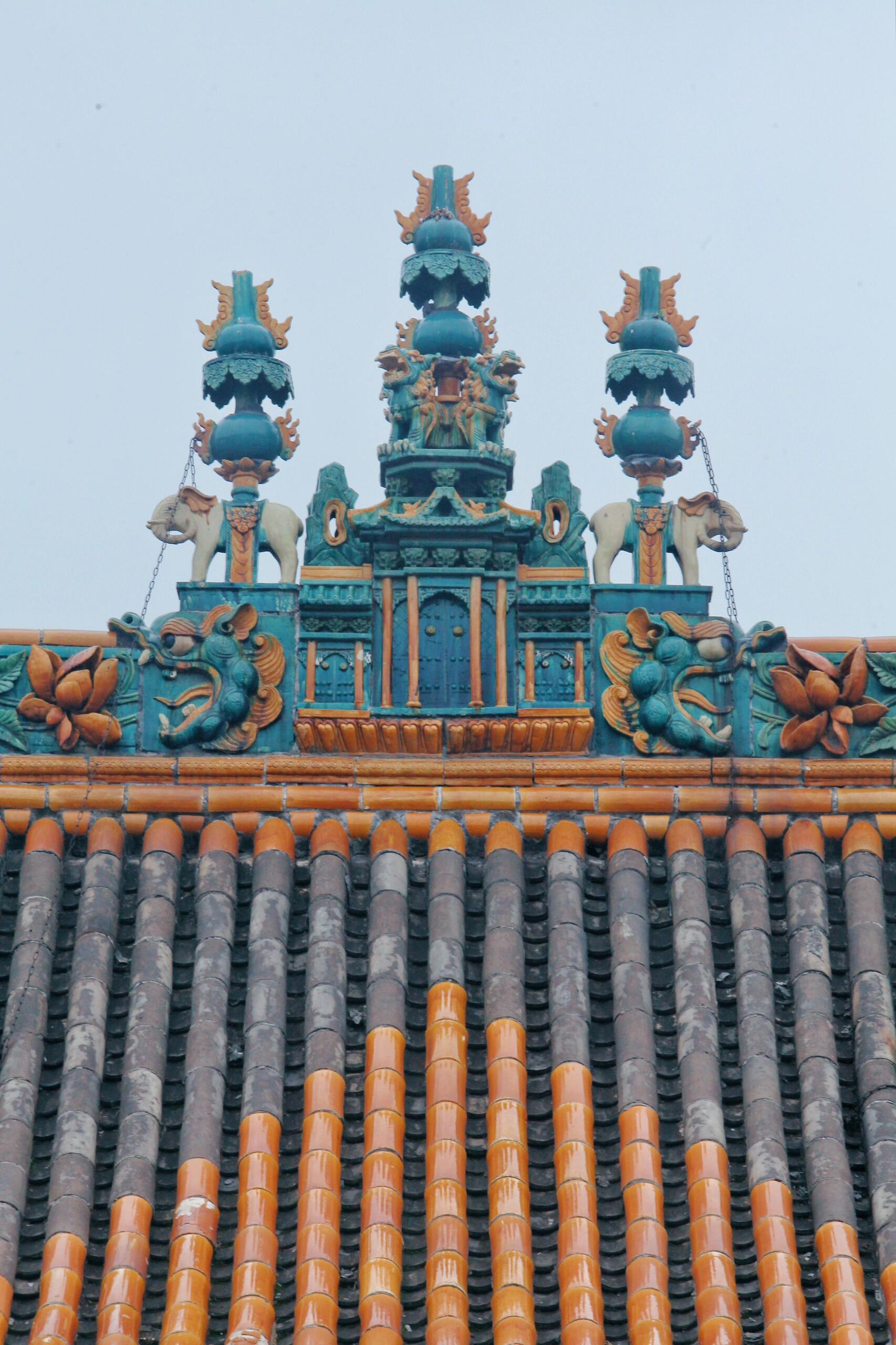 走近正殿,那悬鱼和博风板上的琉璃装饰,更是将琉璃艺术的魅力展现得淋漓尽致。祥云龙腾,只见巨龙蜿蜒盘旋,鳞片在阳光下闪烁着金色的光芒,仿佛下一秒就要冲破束缚,翱翔天际;日月同辉,太阳与月亮的图案栩栩如生,散发着柔和的光芒,寓意着阴阳和谐、天地有序;花团锦簇,各种花卉争奇斗艳,花瓣的纹理细腻逼真,仿佛能闻到阵阵花香。这些琉璃装饰相互映衬,营造出一种华丽而庄重的氛围,让人不禁感叹古代工匠们的精湛技艺和无穷创造力。他们以琉璃为画笔,以庙宇为画布,绘制出了这一幅幅震撼人心的艺术杰作。