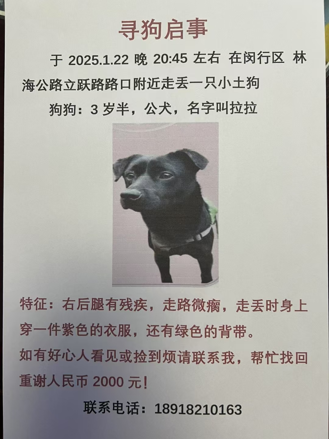 于2025年1月22日晚上20:45左右,在上海市闵行区林海公路立跃路路口附近被鞭炮声吓跑丢失。丢失时身上穿有紫色衣服和绿色背带(可能遗失),右后腿笔直不能弯曲,看到喊它名字会有反应的。狗狗不值钱,养久了感情无价,丢失后家人非常着急,希望附近的好心人帮忙转发此消息,让狗狗早点回家,感谢大家!
