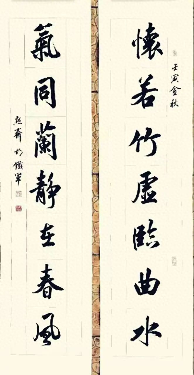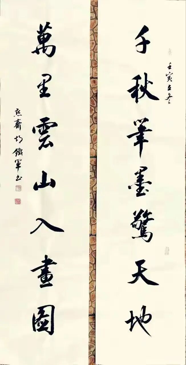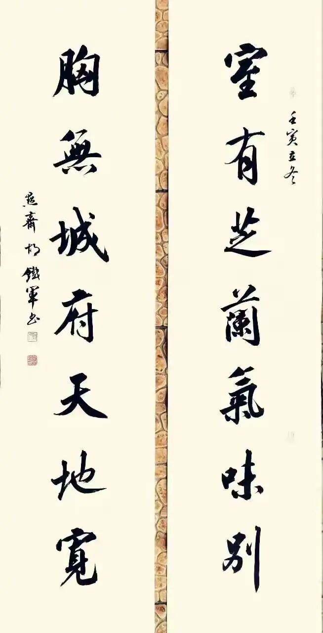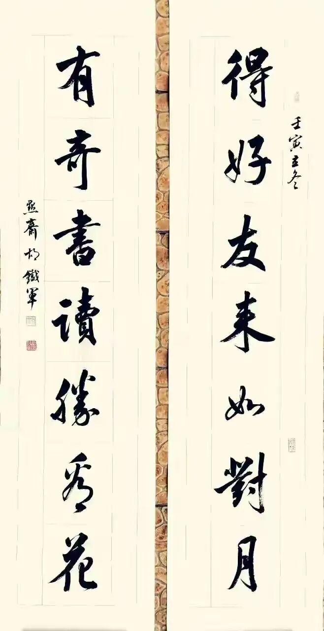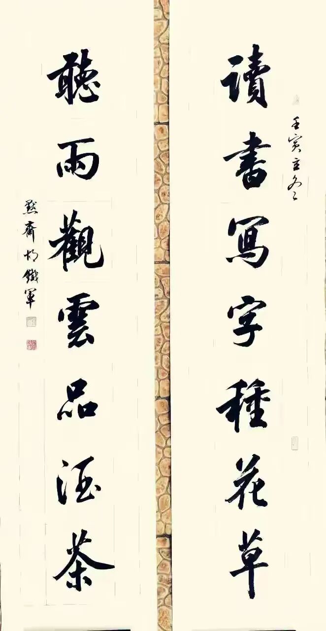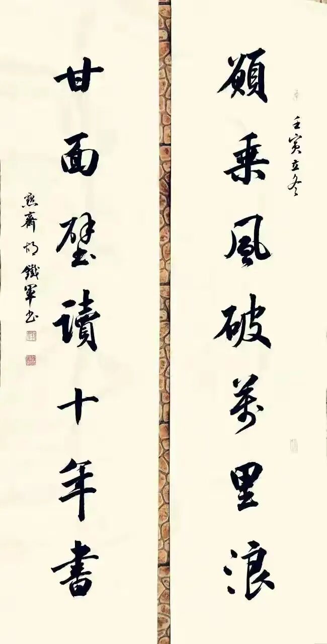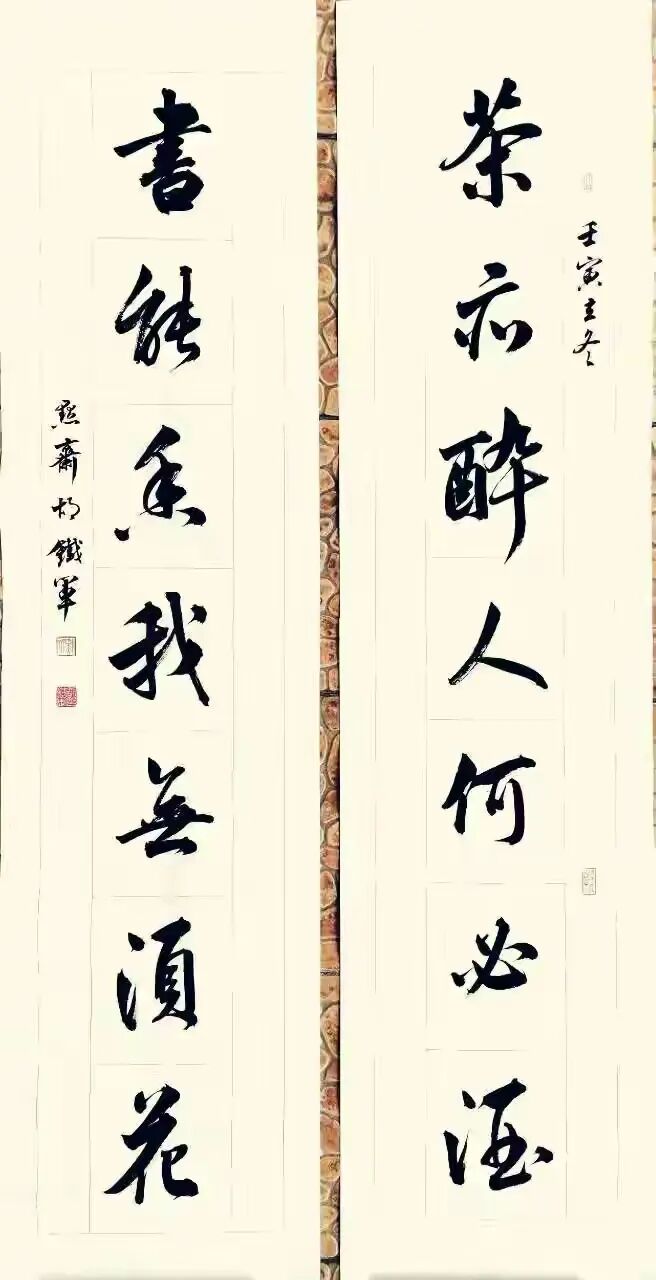 这七幅对联均为当代实力派书家胡铁军的行书佳作。从临习角度看,其作品法于二王、褚遂良,兼融米芾与董其昌,行楷相融,法度严谨而气韵灵动,是极佳的行书进阶范本。以下按单幅逐一解析临习要点: