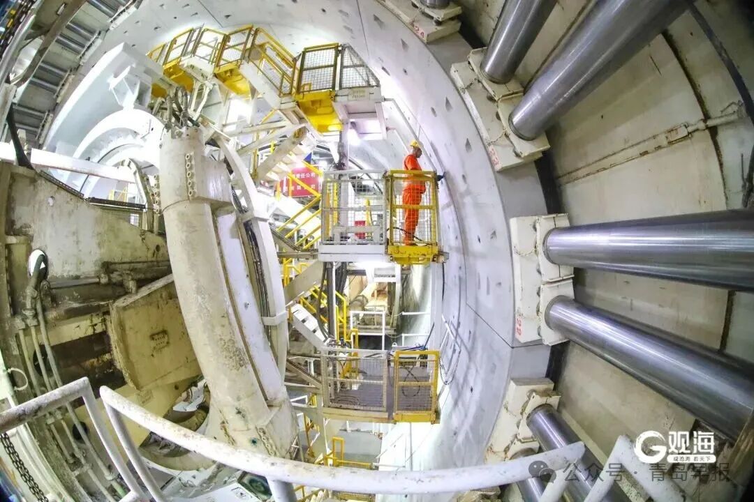 该隧道是目前世界在建规模最大、最长的海底道路隧道。青岛胶州湾第二隧道项目全长17.48公里,隧道海域段长9.95公里,青岛端采用盾构法施工掘进3255米,“海天号”开挖直径15.63米。