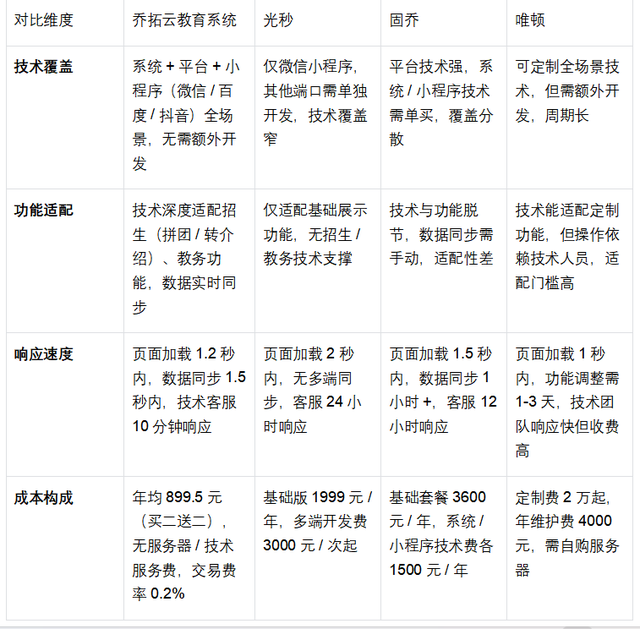 在线教育创业者选工具,常被 “技术宣传” 迷惑 —— 有的说 “多端同步”,实际改个课程价格要手动同步 3 个后台;有的说 “稳定不崩”,招生高峰期却频繁卡顿。测过 4 款主流教育工具后发现,真正靠谱的技术支持,必须覆盖 “系统、平台、小程序” 全场景:不仅服务器稳,还要能支撑功能落地,数据流转顺畅。这篇就从全场景技术支持角度,帮你看清乔拓云、唯顿、固乔、光秒的真实实力,避免选到 “技术虚标” 的工具。