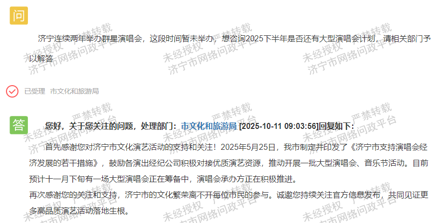 近日,济宁名城事小编从相关渠道获悉,有网友在济宁市网络问政平台就 2025年下半年济宁市是否还有大型演唱会计划提出咨询。