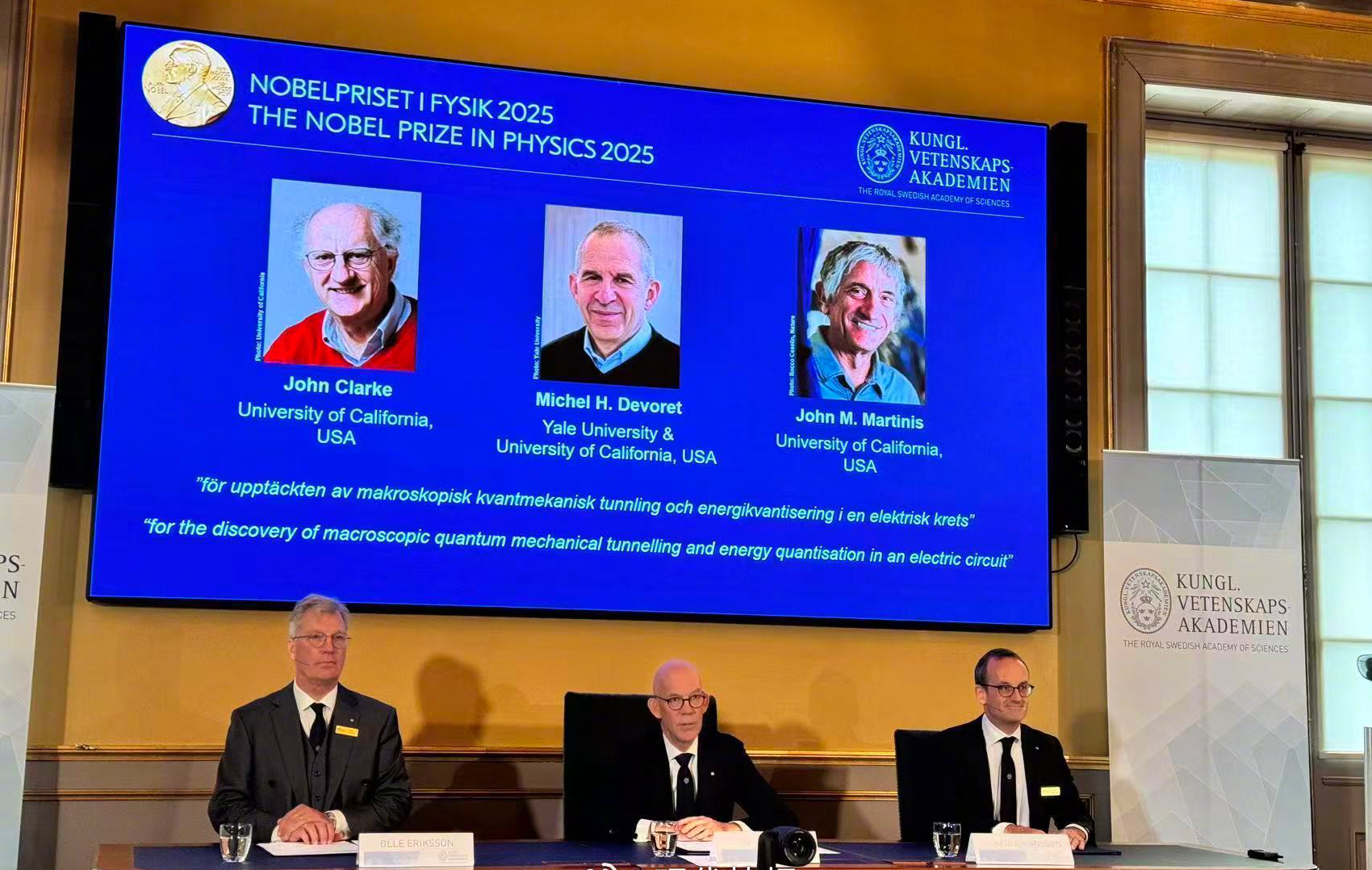 2025年诺贝奖物理学奖揭晓,英国物理学家约翰·克拉克、法国物理学家米歇尔·H·德沃雷、美国物理学家约翰·M·马丁尼斯荣获诺贝尔物理学奖。
