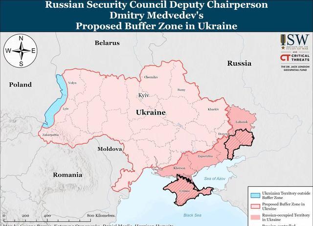 梅德韦杰夫表示,俄罗斯需要建立一个包括绝大部分乌克兰土地的战略缓冲区,乌克兰只能保留与波兰接壤的沃伦州和利沃夫州一小块区域。