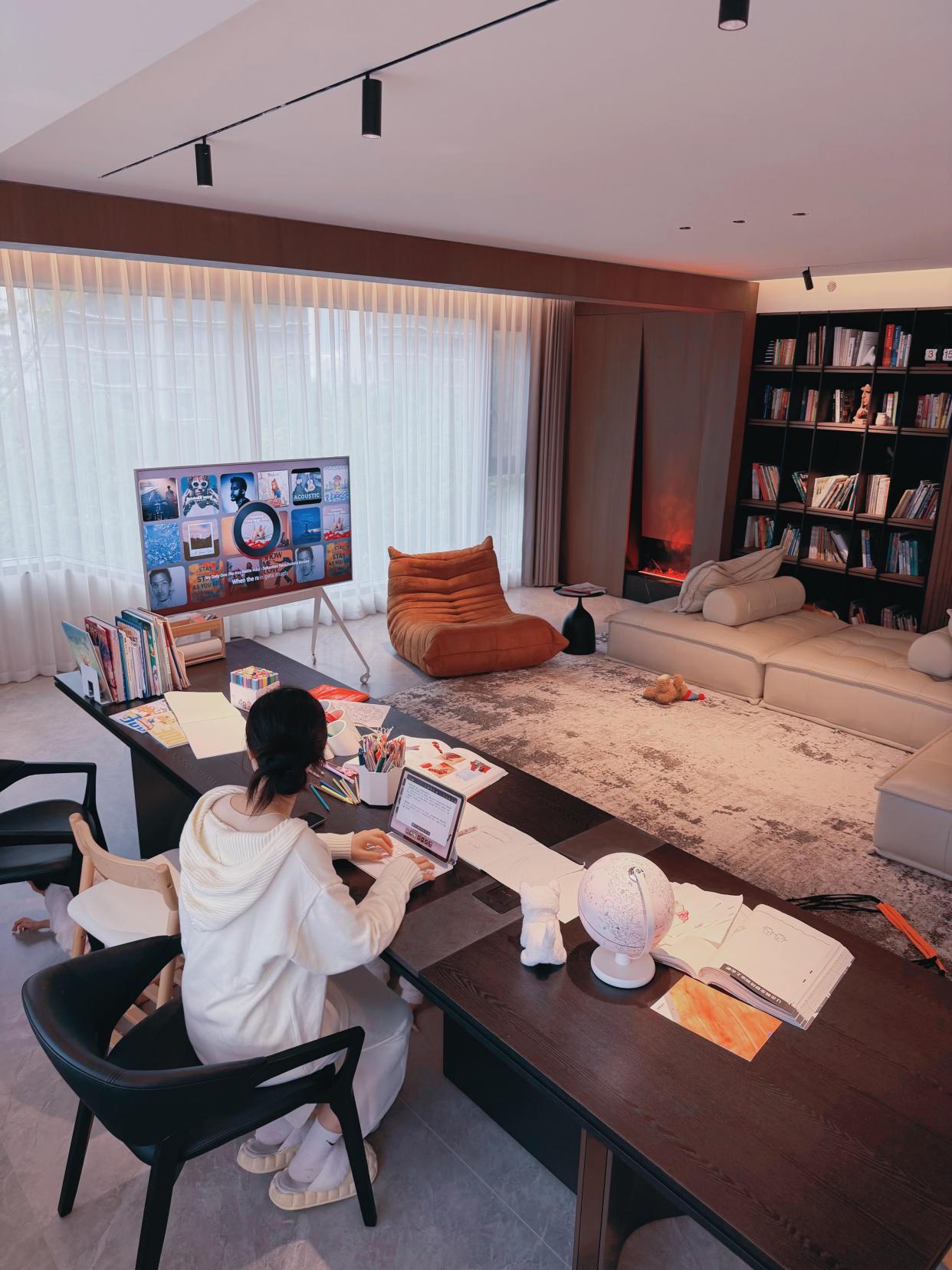 可以把书房搬到客厅,用书柜代替电视背景墙,用投影代替电视, 一张长木桌,大人工作,小孩学习,都可以在这里进行。