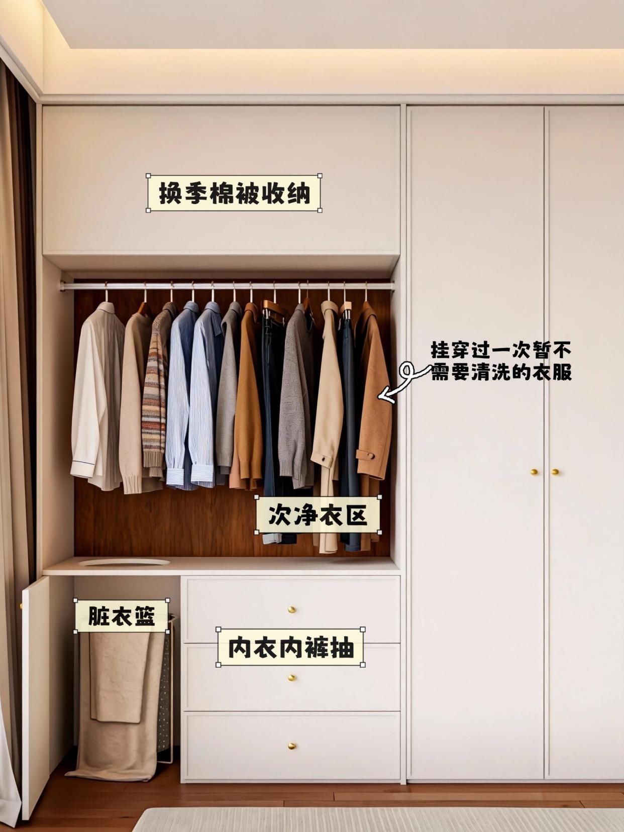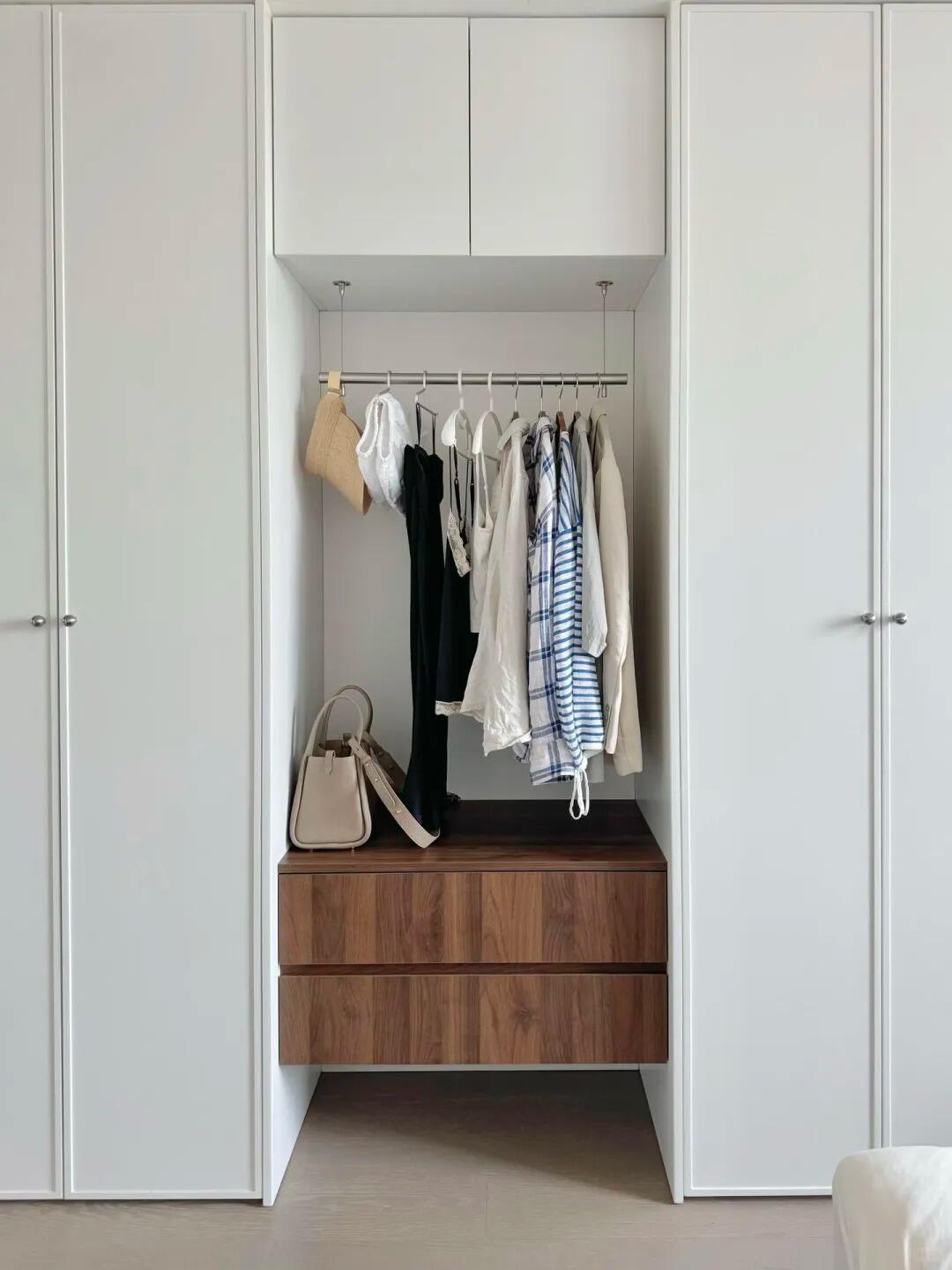 你可以在衣柜侧边,专门做个开放式挂衣区,那些“半干净”的衣服就有了专属处,再也不用到处乱堆了!
