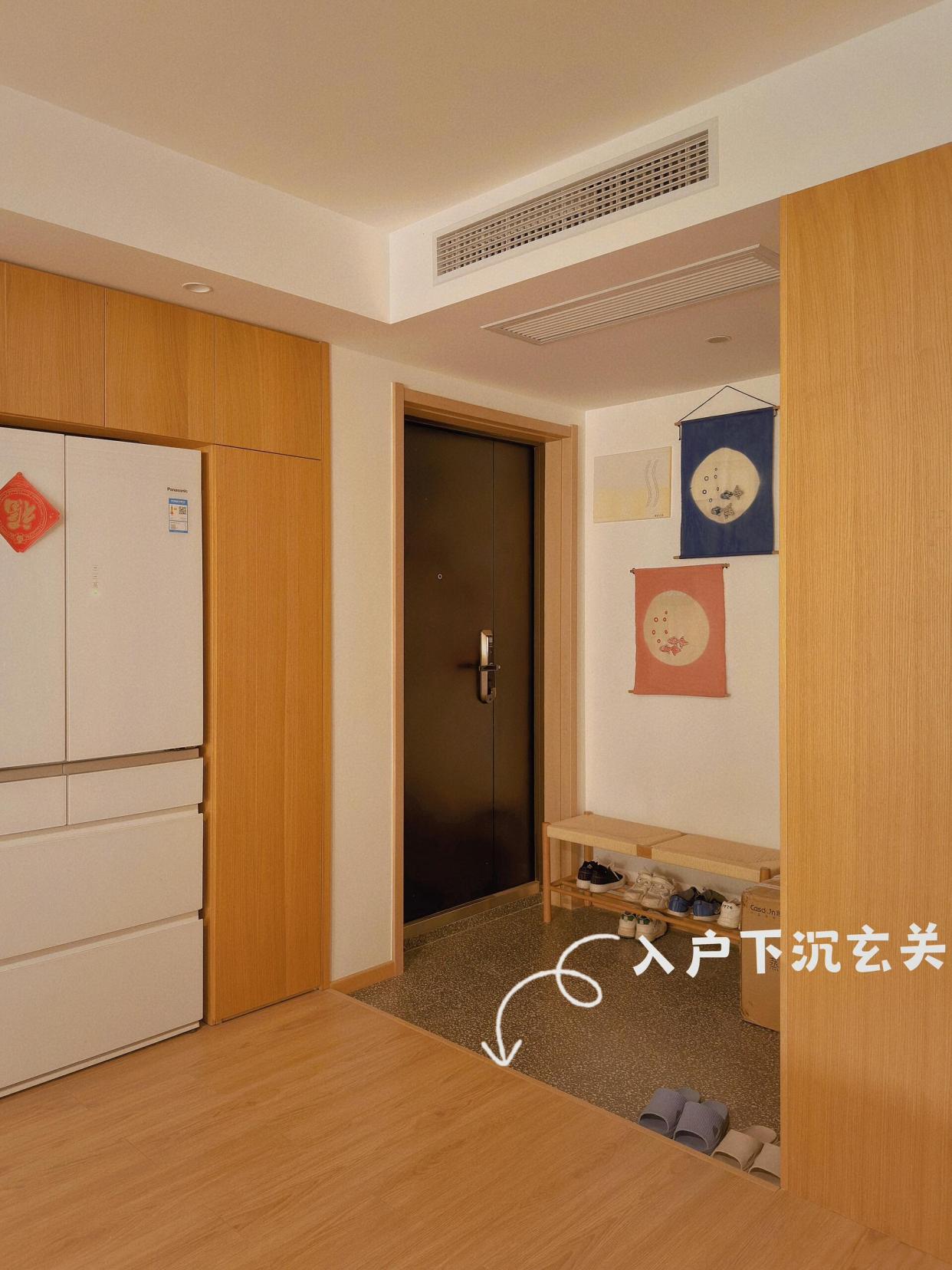 在做这个设计时,可以利用地暖高差来做下沉玄关,施工时入户下沉这一块区域不铺地暖,跟屋内就有了一个高度差,两个区域的地面颜色最好作明显区分,这样不容易因为马虎而绊倒。