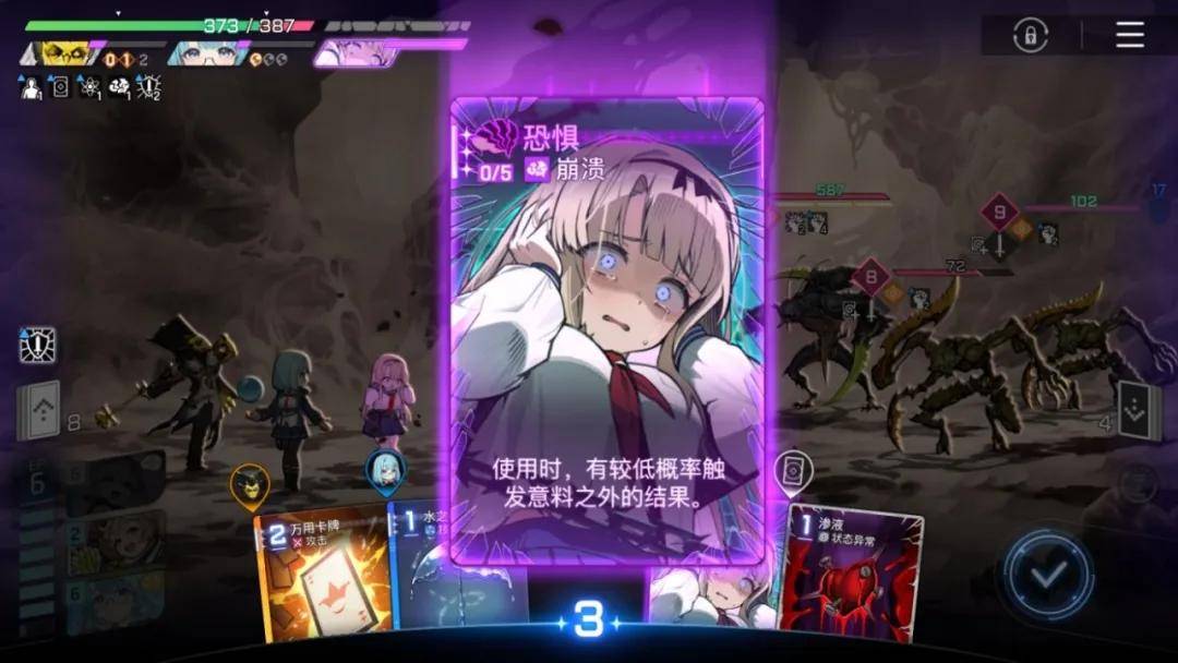 在副本规则中,《卡厄思梦境》还引入了压力值的概念。这一设定类似于很多克苏鲁式游戏中的SAN值,压力值会随角色受到伤害而上升,涨满之后就会让角色“崩溃”,崩溃后的角色卡牌将变为“崩溃卡”,没有任何效果。此时玩家必须打出手中特定数量的角色崩溃牌才能让角色恢复。打出崩溃牌时,角色有概率作出攻击友军等对自己不利的行动,但出完牌之后角色就能恢复行动、回血并得到增益。