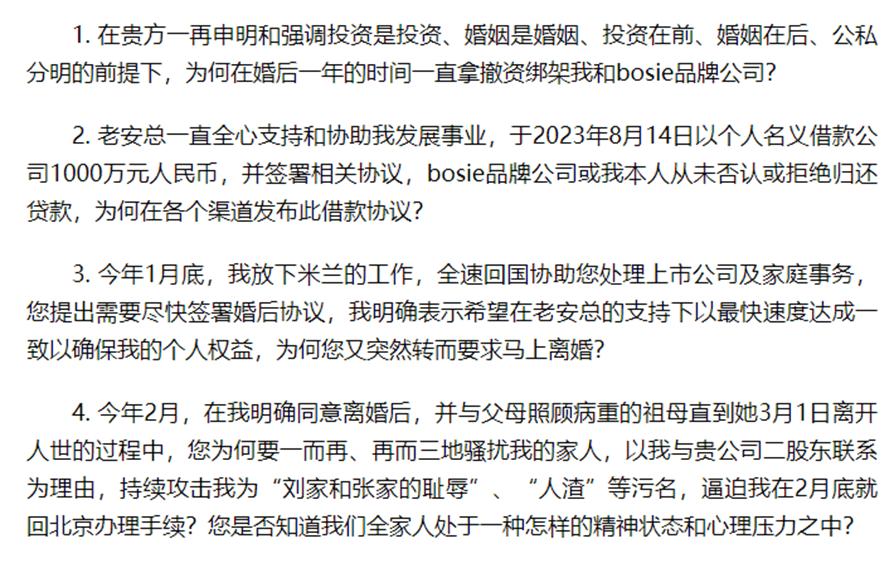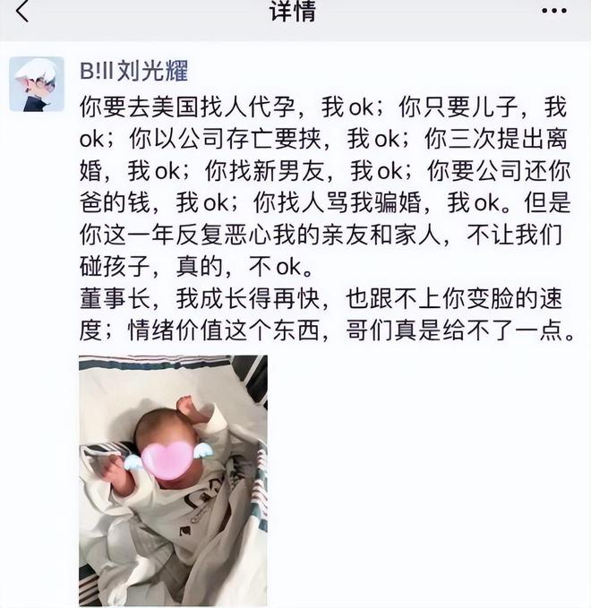 其中包括:指控妻子拿撤资威胁自己、私自公开借款协议、逼迫签署婚后协议、孩子探视权,以及在自己明确同意离婚后还骚扰家人,以逼迫自己尽快签署离婚协议、无缝衔接新男友、污蔑自己性取向不明等“九宗罪”。