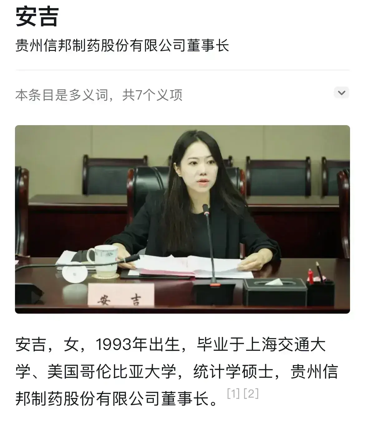 现为上市公司信邦制药董事长,系信邦制药前董事长安怀略之女。2022年5月,安怀略卸任上市公司董事长,由安吉接任。安吉目前是上市公司贵州信邦制药股份有限公司的法定代表人、董事长,个人直接持股1.03%。信邦制药的大股东是贵州金域实业投资合伙企业(有限合伙)(持股18.52%),安吉与父亲安怀略分别持股贵州金域65%和35%。