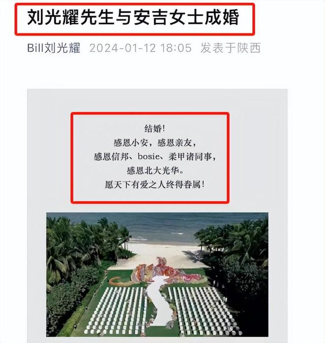 在两人结婚的这一天,刘光耀很高兴,甚至还在自己的社交平台上,发文: