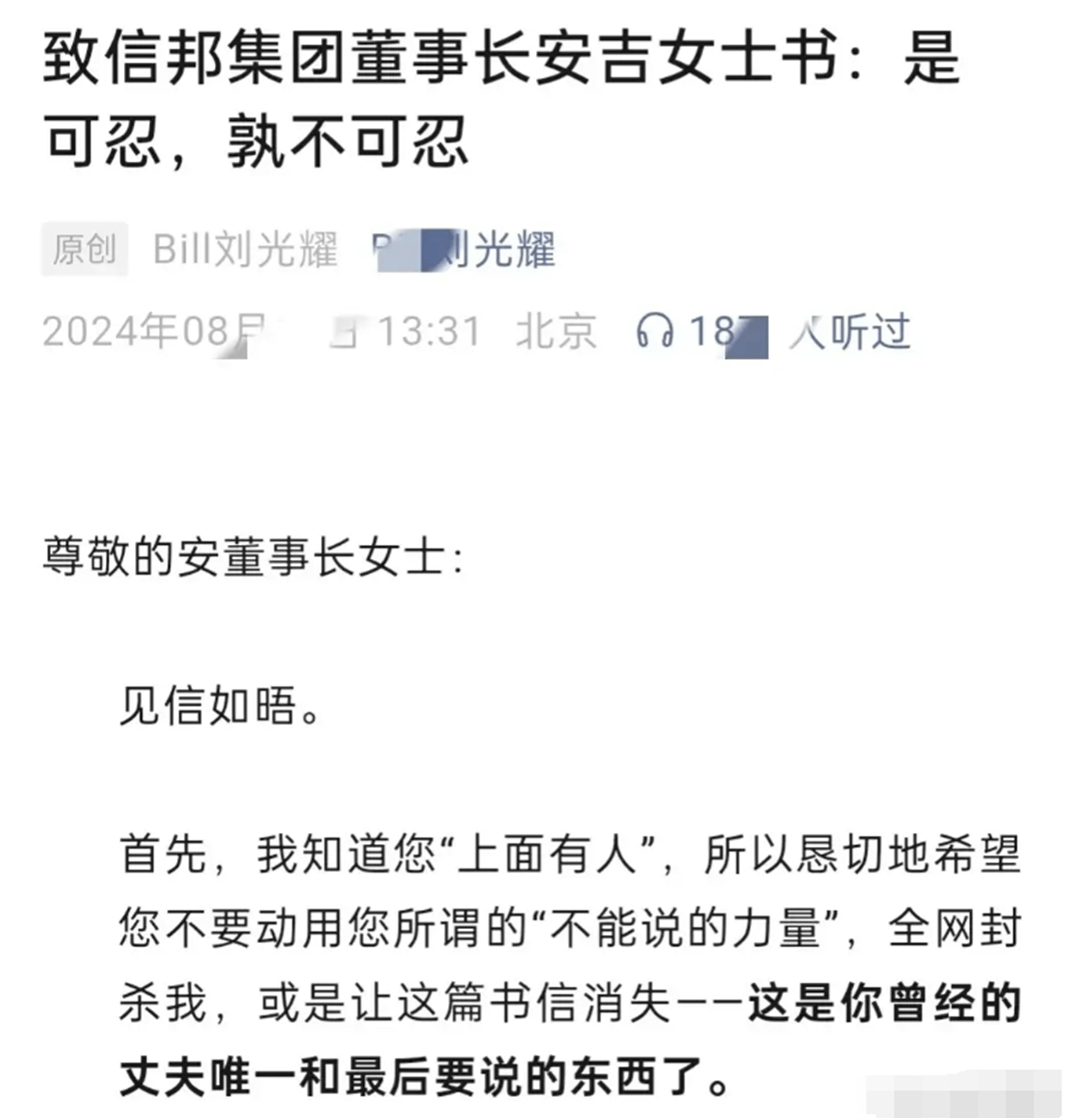 这封信上来就直言,知道前妻“上边有人”,希望前妻看在自己曾经是她丈夫的面子上,不要将自己封杀。