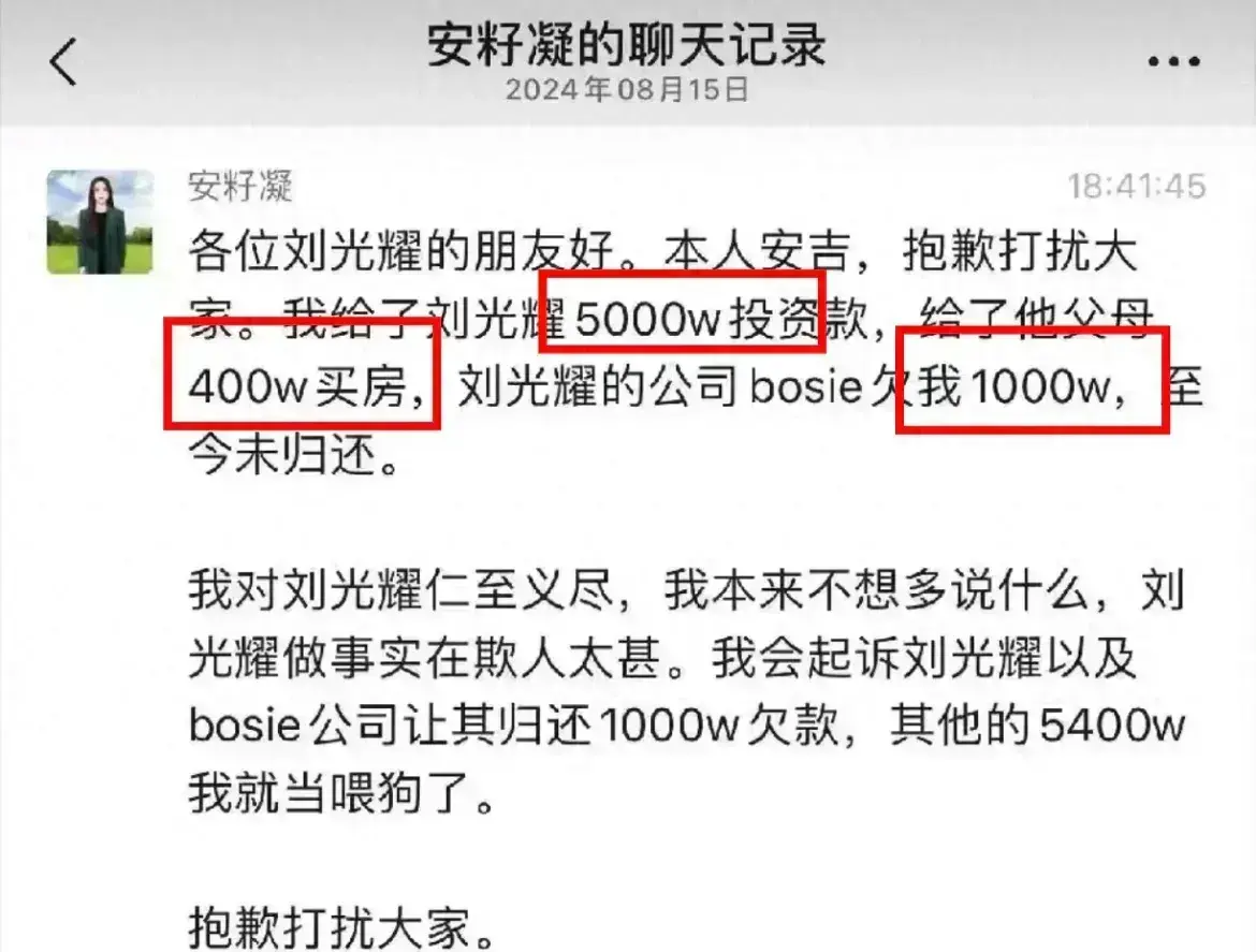 面对刘光耀透露隐私的种种指责,安吉直接摆出自己给对方花的钱。不管是5000万的投资,还是出资400万给刘家父母买房,或是借给他的1000万借款合同。