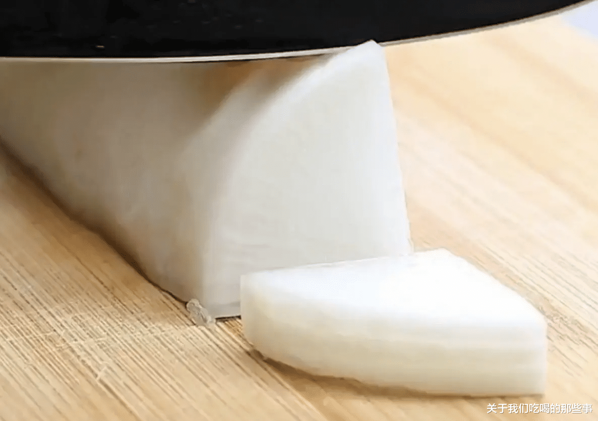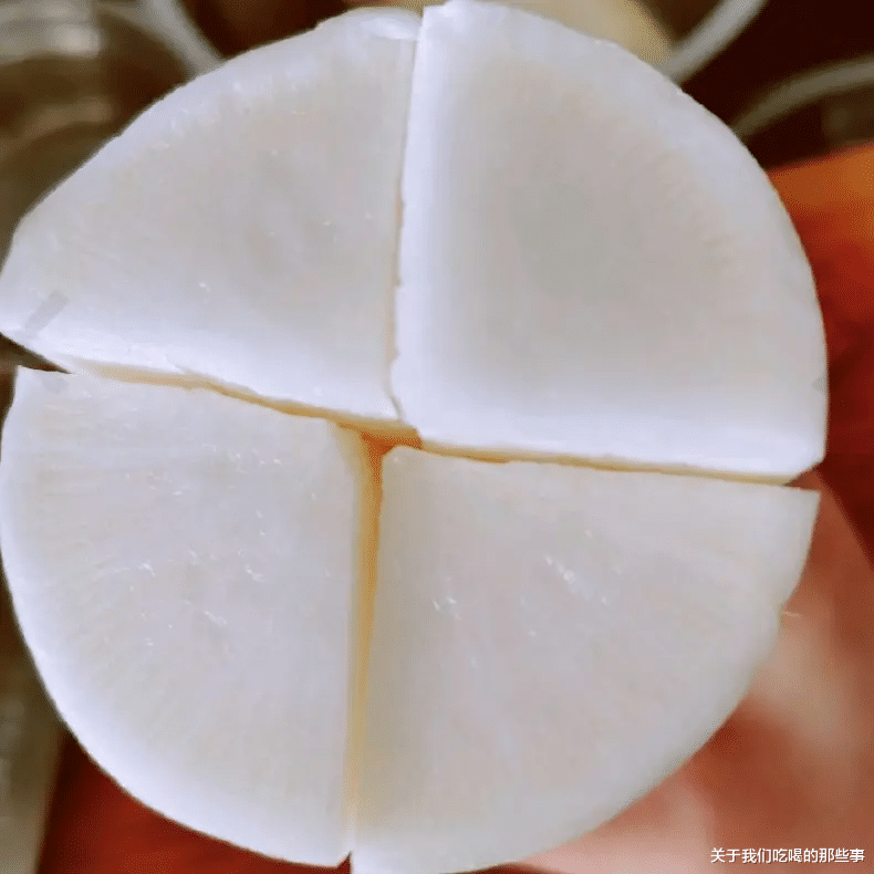 然后将白萝卜切成四份,从切面看呈扇形。切好了取一份切片,切的时候连切两刀或者三刀不切断,第三刀或者第四刀切断,这样切出来不仅好看,还口感好。如果实在嫌麻烦,也可以直接切片,不切太薄就行。