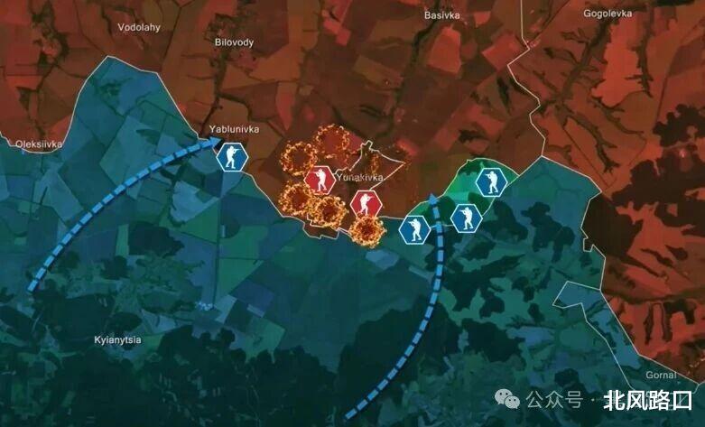 乌克兰战场,苏梅方向,乌军在尤纳基夫卡附近设置火力点,封锁和包围俄军撤退以及后勤路线,尤纳基夫卡的俄军陷入乌军杀伤区,正在被有条不紊的摧毁。