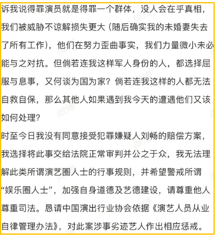 刘奕畅及其背后资本或许以为,受害者即便在役也不过是个普通人,吓唬吓唬就能顺利翻篇了事。