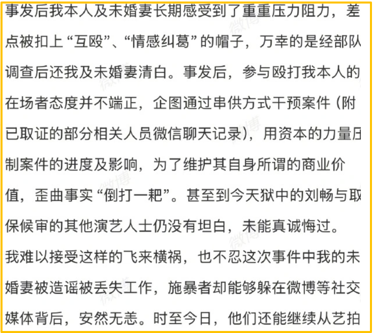 网友报警后,刘奕畅等人不仅没有认错态度还利用资本的力量颠倒黑白,比如长期骚扰受害者及其未婚妻、用造谣清白及串供的方式,将单方面施暴扭曲成因感情纠纷导致的互殴。