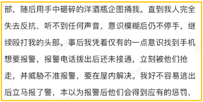 被婉拒后以刘奕畅为首的一行人对该网友进行惨无人道的群殴,手段包括但不限于拳打脚踢、勒到窒息、用喝光的空洋酒瓶子猛砸该网友头部。