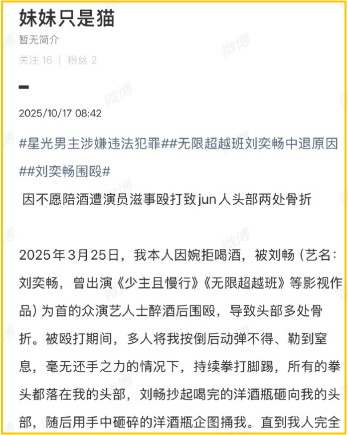 没想到18线小明星刘奕畅,竟然仅因为素人拒绝陪酒,就将对方的脑袋打骨折了,并且还利用资本力量干涉司法公正。