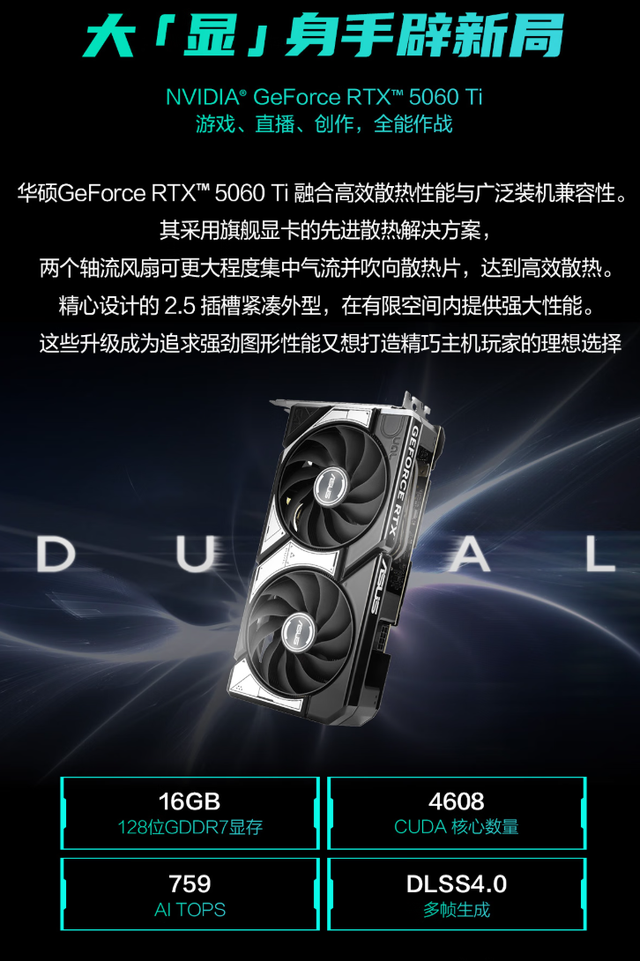 显卡性能强劲:娱乐创作两相宜显卡方面,华硕天选6X选用的是NVIDIA GeForce RTX 5060Ti 16G独显,它基于全新Blackwell架构,拥有4608颗CUDA核心,图形算力强劲支持实时光线追踪、DLSS 4多帧生成、DLAA、光线重建、超分辨率等技术。