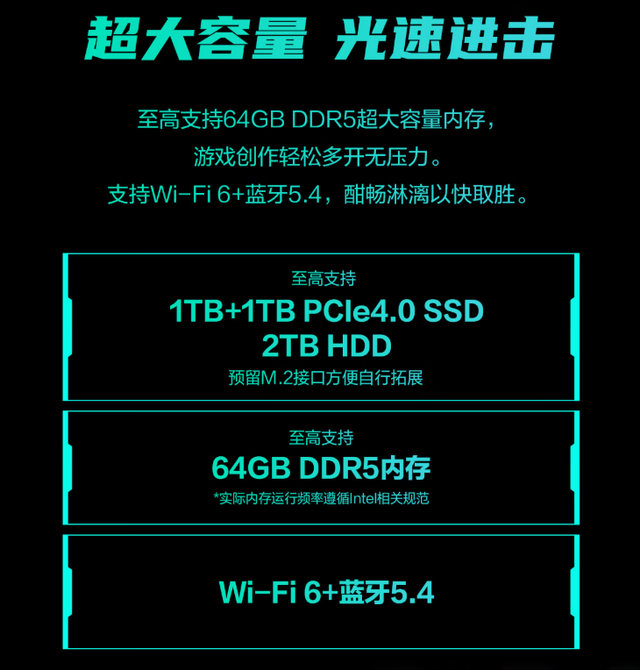 Wi-Fi 6无线网络与蓝牙5.4技术保障网络稳定连接,无线键鼠、耳机配对无忧。预留内存与硬盘扩展位,支持升级至64GB内存及额外存储设备,满足未来需求。