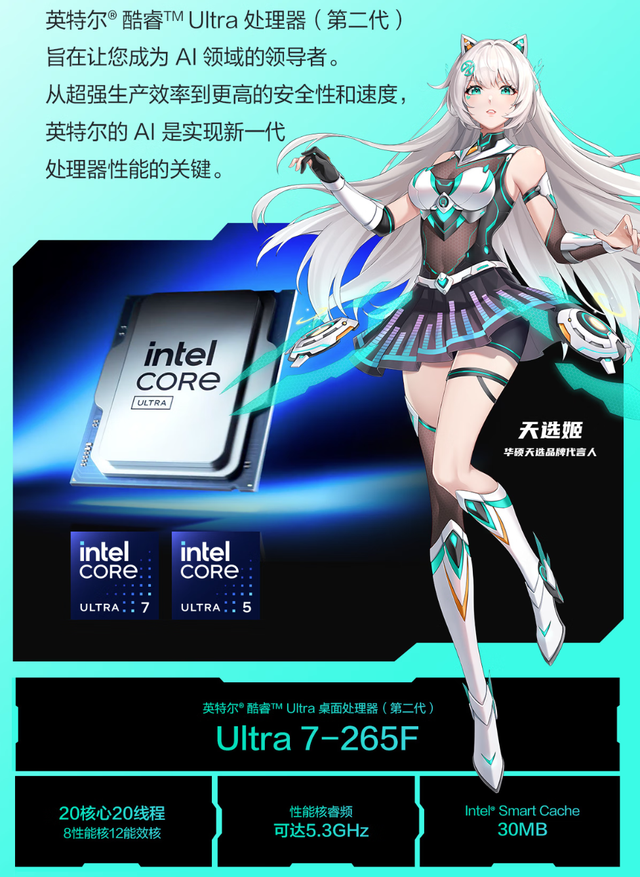 华硕天选6X高性能台式机搭载英特尔酷睿Ultra7-265F处理器,其采用先进的3nm制成工艺,拥有20核(8P+12E)20线程,最高睿频可达5.3GHz,性能澎湃为多任务处理提供强大动力。无论是视频剪辑、3D渲染,还是大型数据运算,都能轻松应对.