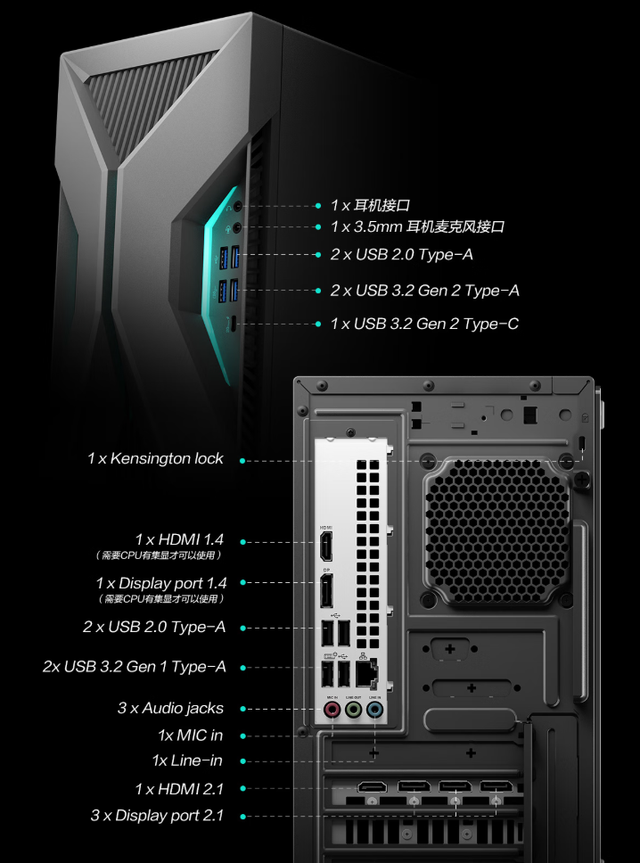 除了高能颜值外,机身上预留了丰富的接口配置,前置2×USB 2.0 Type-A、2×USB 3.2 Gen2 Type-A、1×USB 3.2 Gen2 Type-C及音频接口,方便连接临时外设连接与手机充电;后置HDMI、DP视频输出及多USB接口,支持多屏协作与高速数据传输。