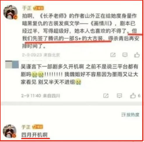 除了这组照片外,吴谨言的老板于正,也透露了一个重磅消息。他表示,吴谨言将在4月份进组拍戏。