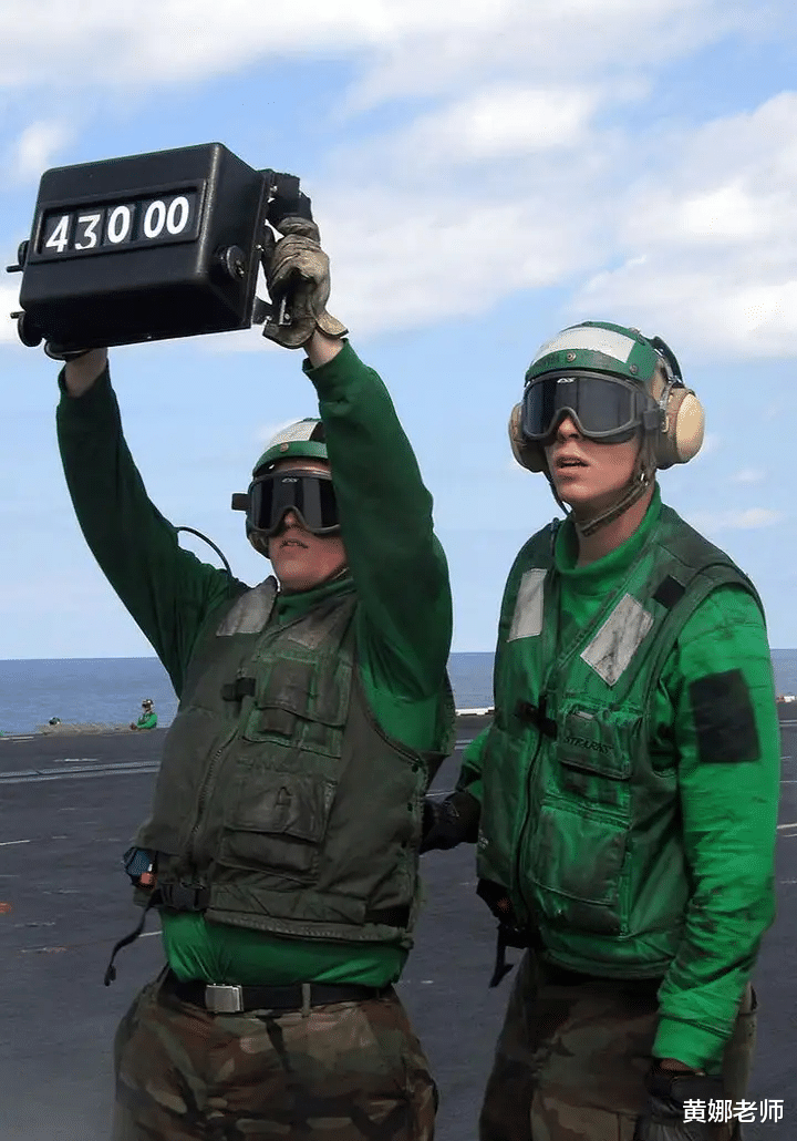 告知飞行员时,“绿马甲”通常是将重量牌举过头顶;向弹射器操作员展示的时候,则会蹲下放在侧身。