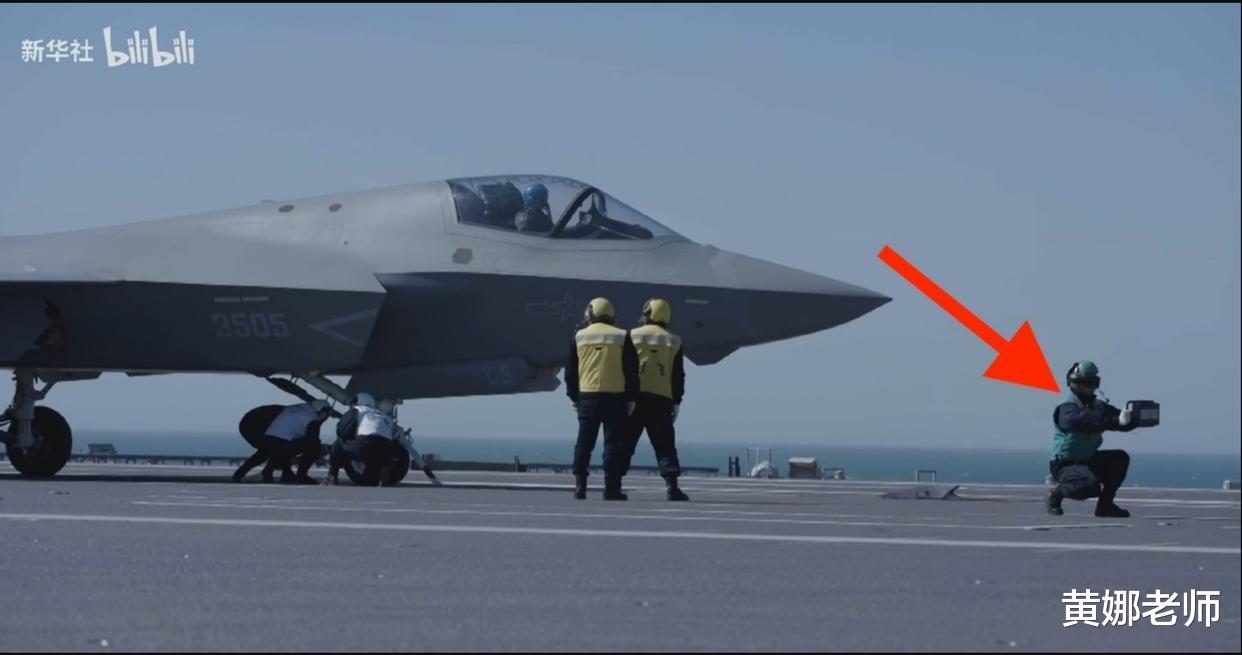 你看,战机弹射前,一名身着绿色马甲的地勤人员双手举着一个LED屏,一会儿朝着飞行员,一会儿朝着弹射器控制站,似乎在展示什么信息。