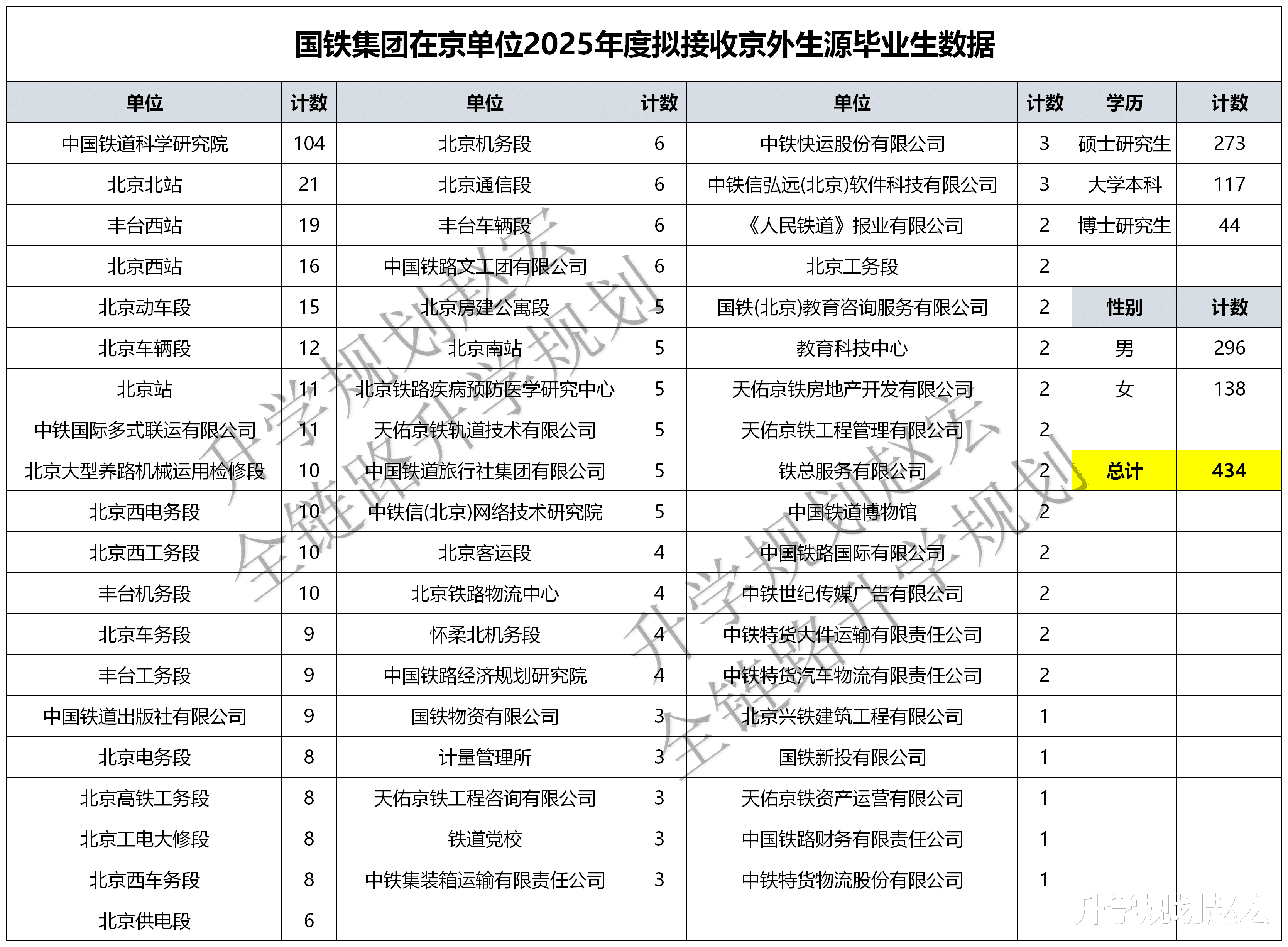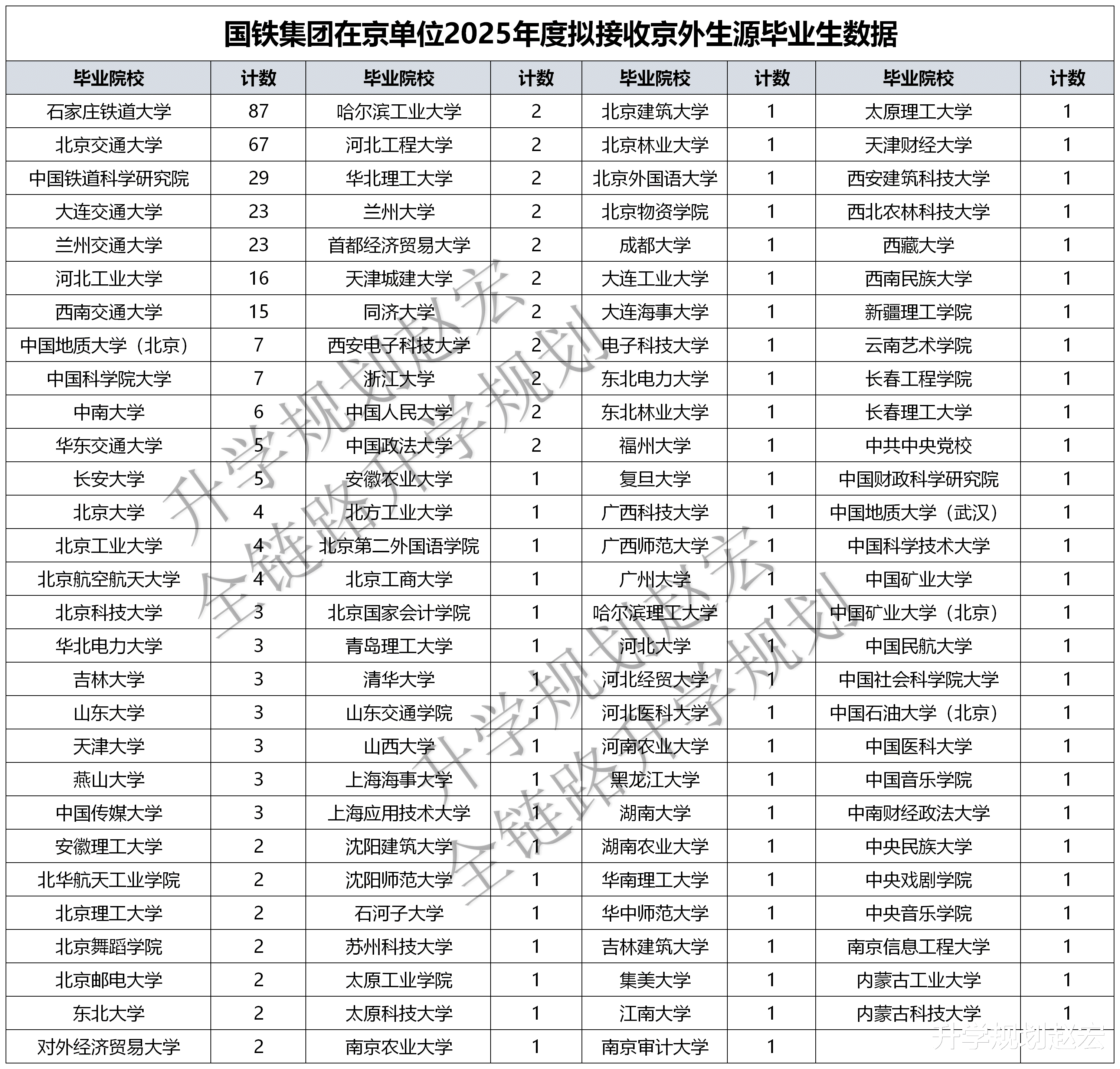 很久没跟大家更新就业数据了,主要是现在的数据大多都是加密的,或者 就是加水印的。对于数据加工来说,增加了很多的工作量,同样就业数据,我们也会等公示期过后,我们再来跟大家分享。现在信息获取越来越容易,但是也越来越难了,不信大家去找找,看你能够找到多少?近期对于落户北京的数据比较多,对于在北京的单位,不管是总部还是北京分部,只要是京外生源,满足落户条件的都要公示。如果大家未来想要去这样的城市,那么可以多多关注,本文咱们来看看国铁集团在京单位2025年度接收京外生源毕业生数据,总共434人,人数最多的是石家庄铁道大学,专业人数最多的是交通运输。