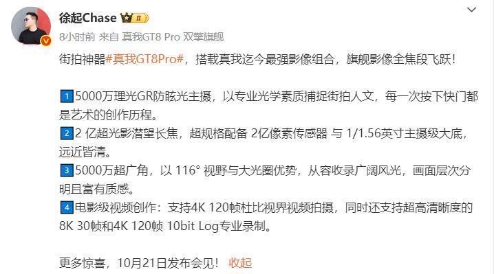 另外,根据官宣信息显示,除了拍照之外,真我GT8 Pro的视频拍摄能力同样突出,支持4K 120帧杜比视界视频录制,带来高动态范围与影院级色彩表现。同时,该机还支持8K 30帧以及4K 120帧10bit Log专业视频录制,为内容创作者提供更大的后期调色空间和创作自由度。同时, @徐起Chase “#真我GT8Pro# 完全满足大家的需求,长焦人像拍人更美,远近皆可拍!第五代骁龙8至尊版+2亿超光影潜望长焦,游戏和女友不必二选一!”
